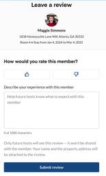 When a member moves out, you’ll be asked to leave a review that will be shared with future hosts, but not with the member. These reviews help other hosts in our community make more informed acceptance decisions and help us maintain the quality of our platform. Over time, this data will also help us better understand and predict member outcomes.