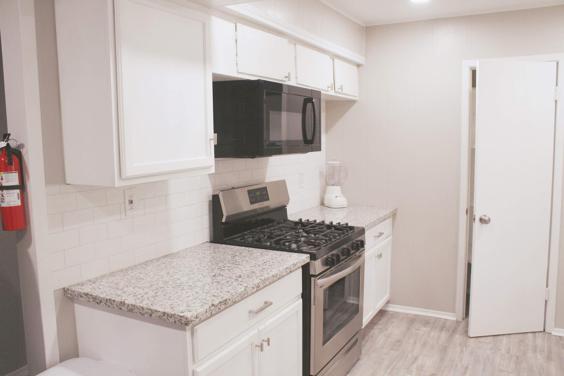 2 full kitchens (stainless steel appliances, 1 built in microwave, air fryer, blender, dishes, pots/pans, and cooking utensils)