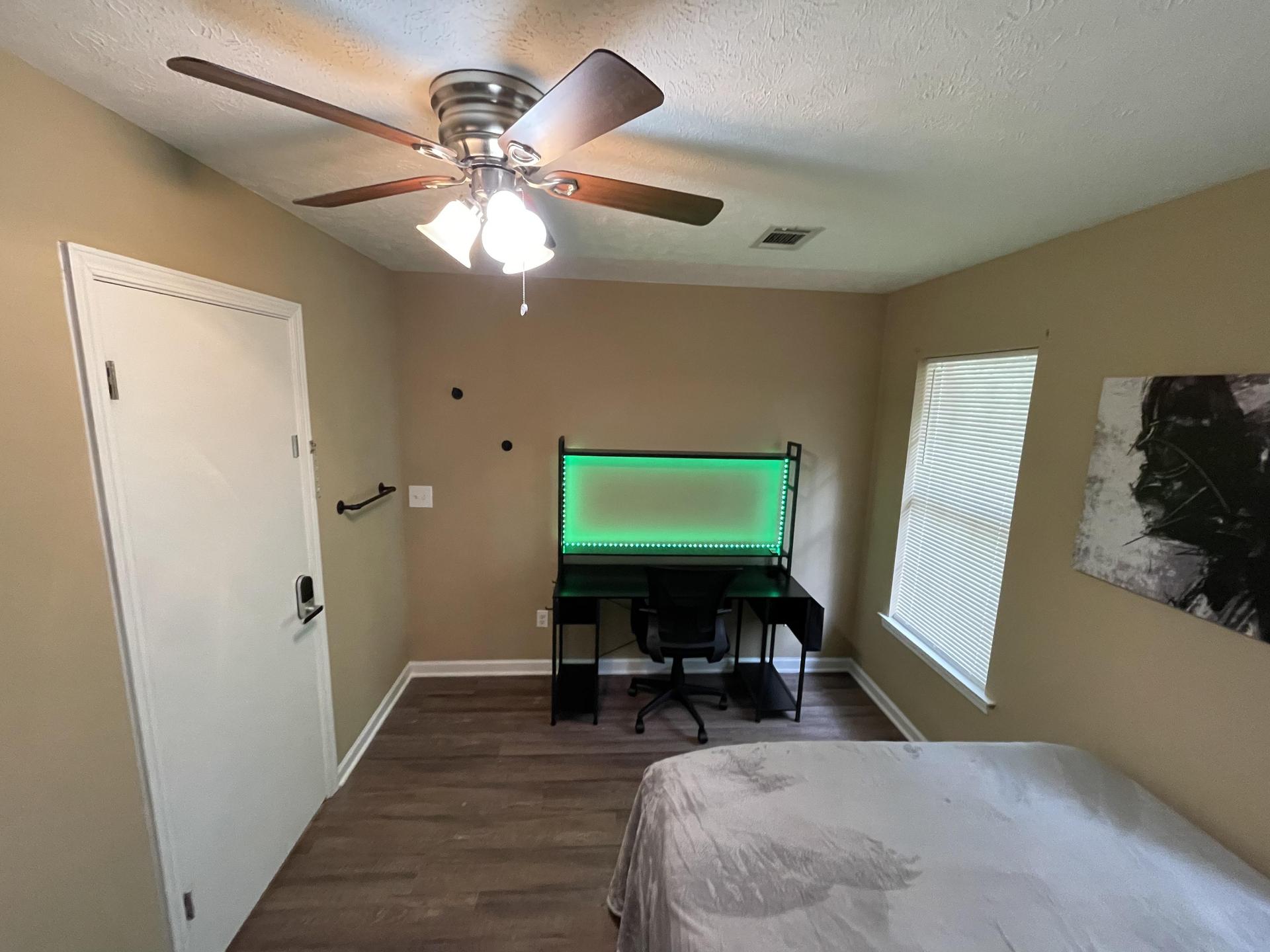 What can I bring?Your Bedroom is just inside the Main Hallway & includes a Queen Memory Mattress, a Gaming Desk & Comfortable Chair, Coat Hooks, Towel Rack, Wall Shelf w/ Bathroom Tote Hooks, & Wall Art.