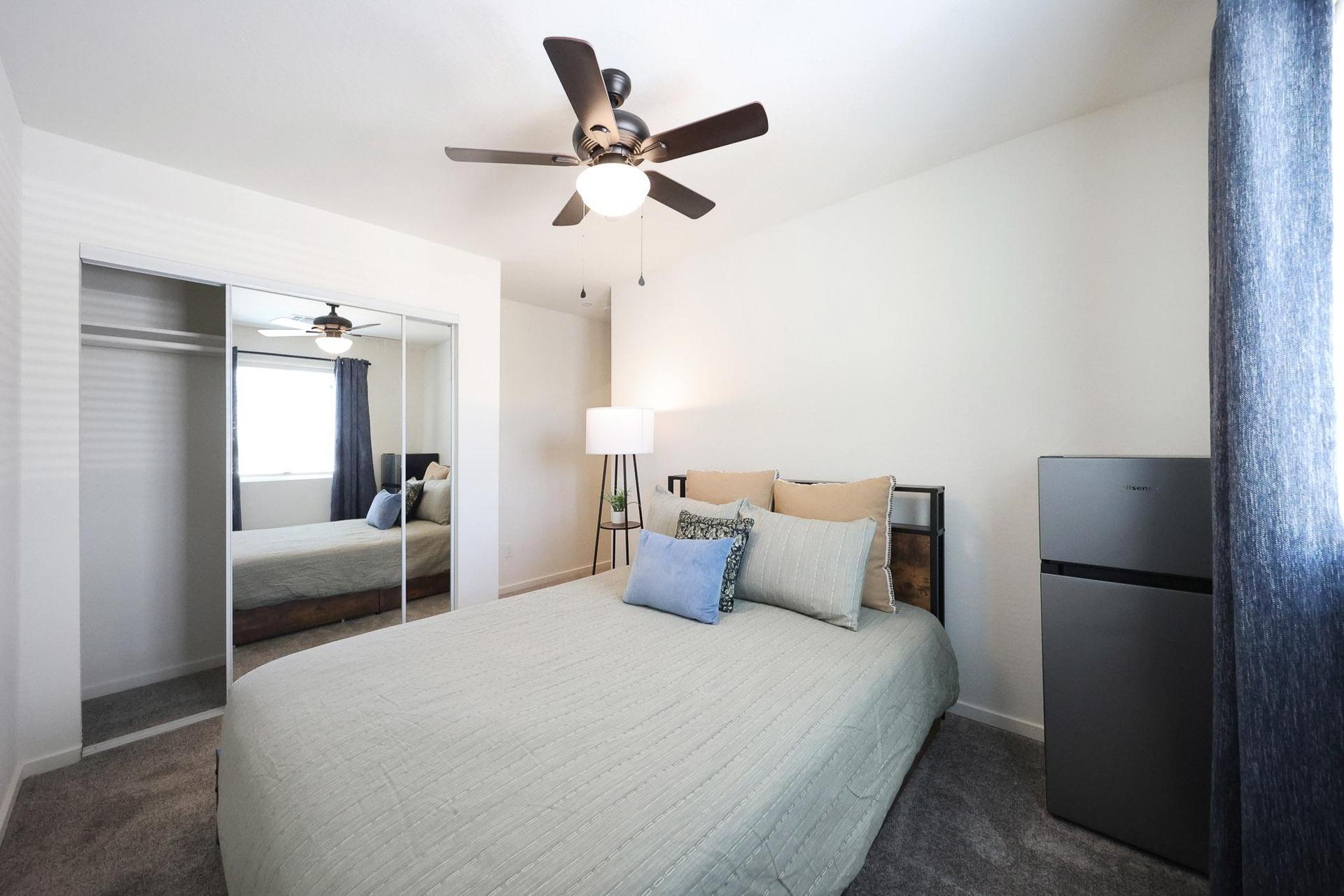 Comfortable private room with closet, ceiling fan, and access to shared kitchen, bath, and in-unit laundry.