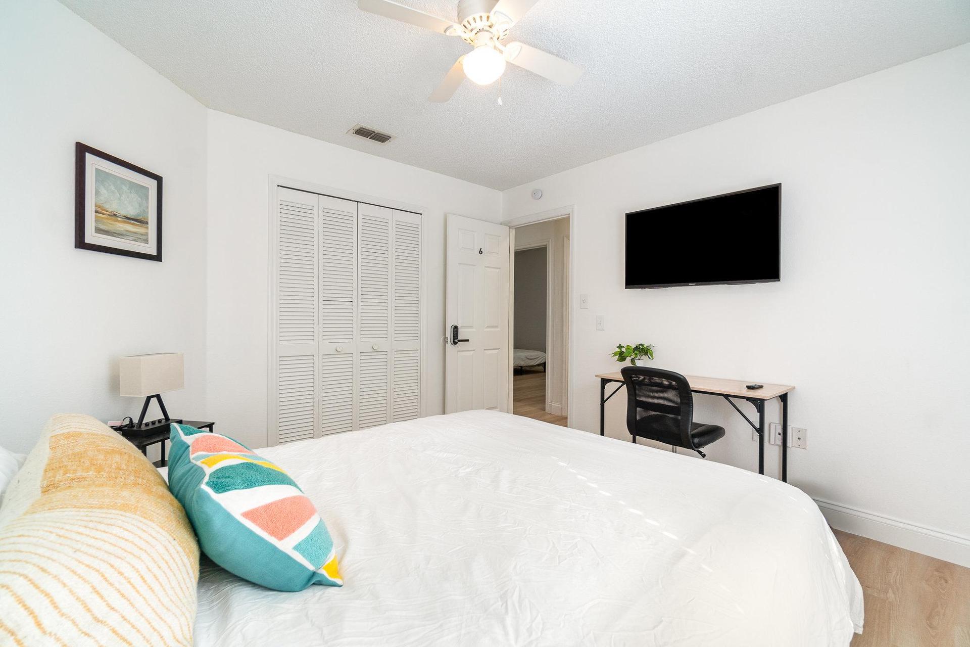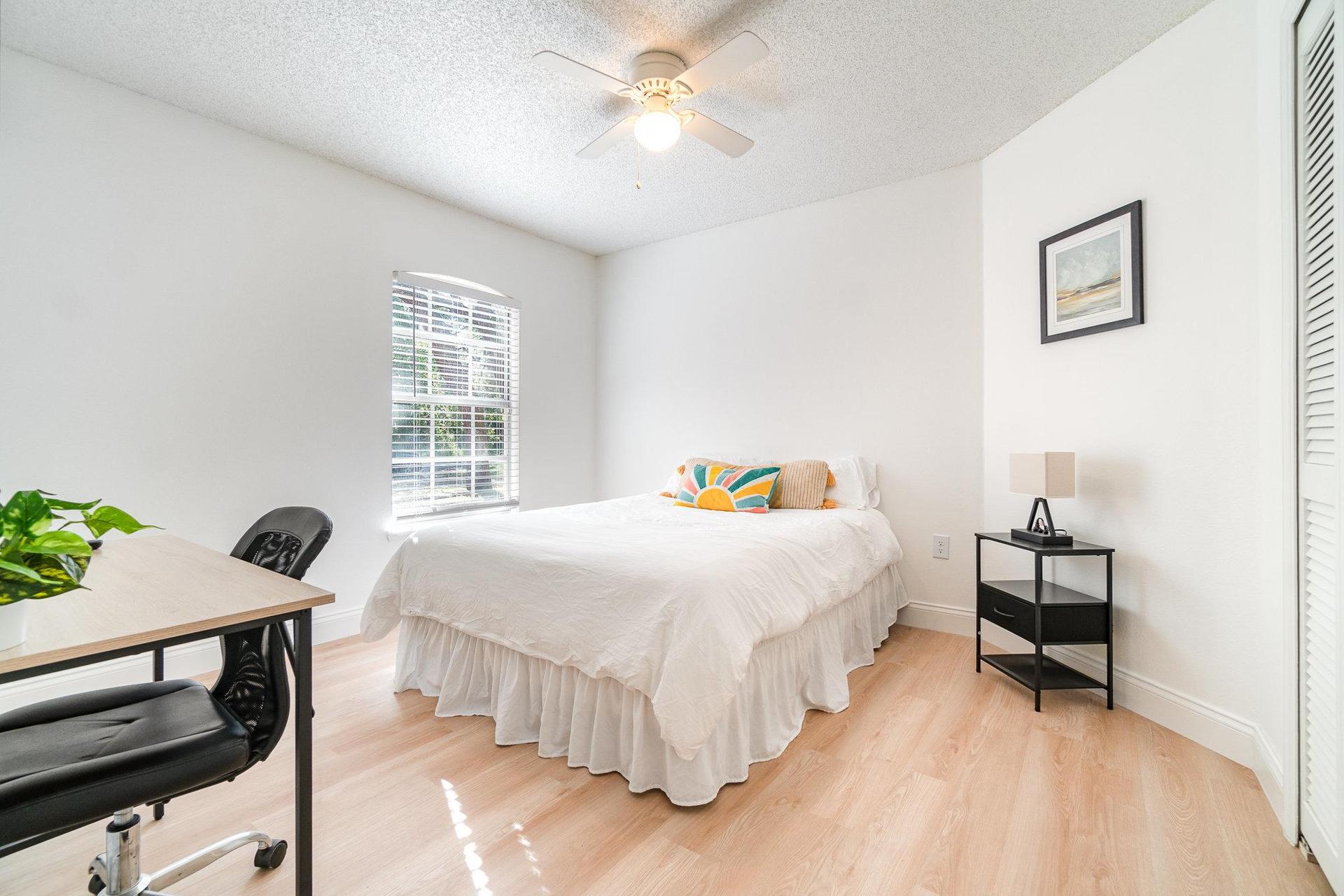 This bright and airy bedroom offers the perfect blend of comfort and functionality! This room combines everything you need for a comfortable stay, whether you're looking for a peaceful night's sleep, a productive workspace, or simply a clean, private space to call your own.