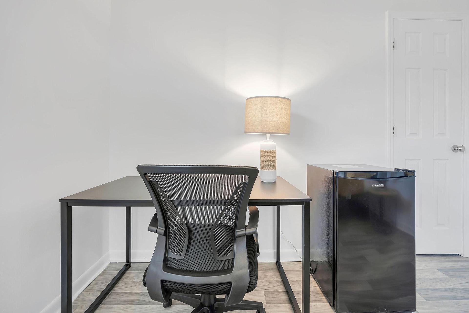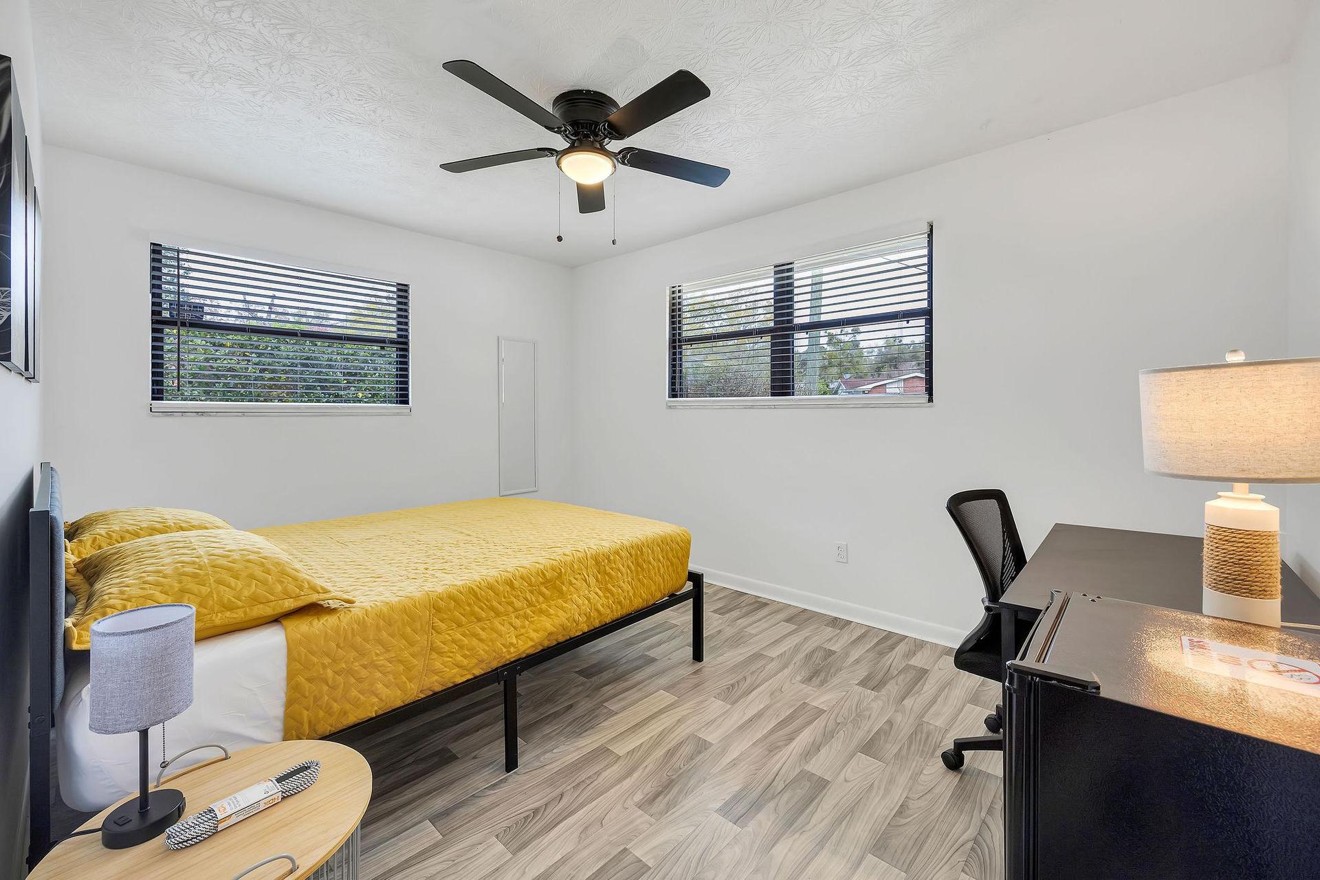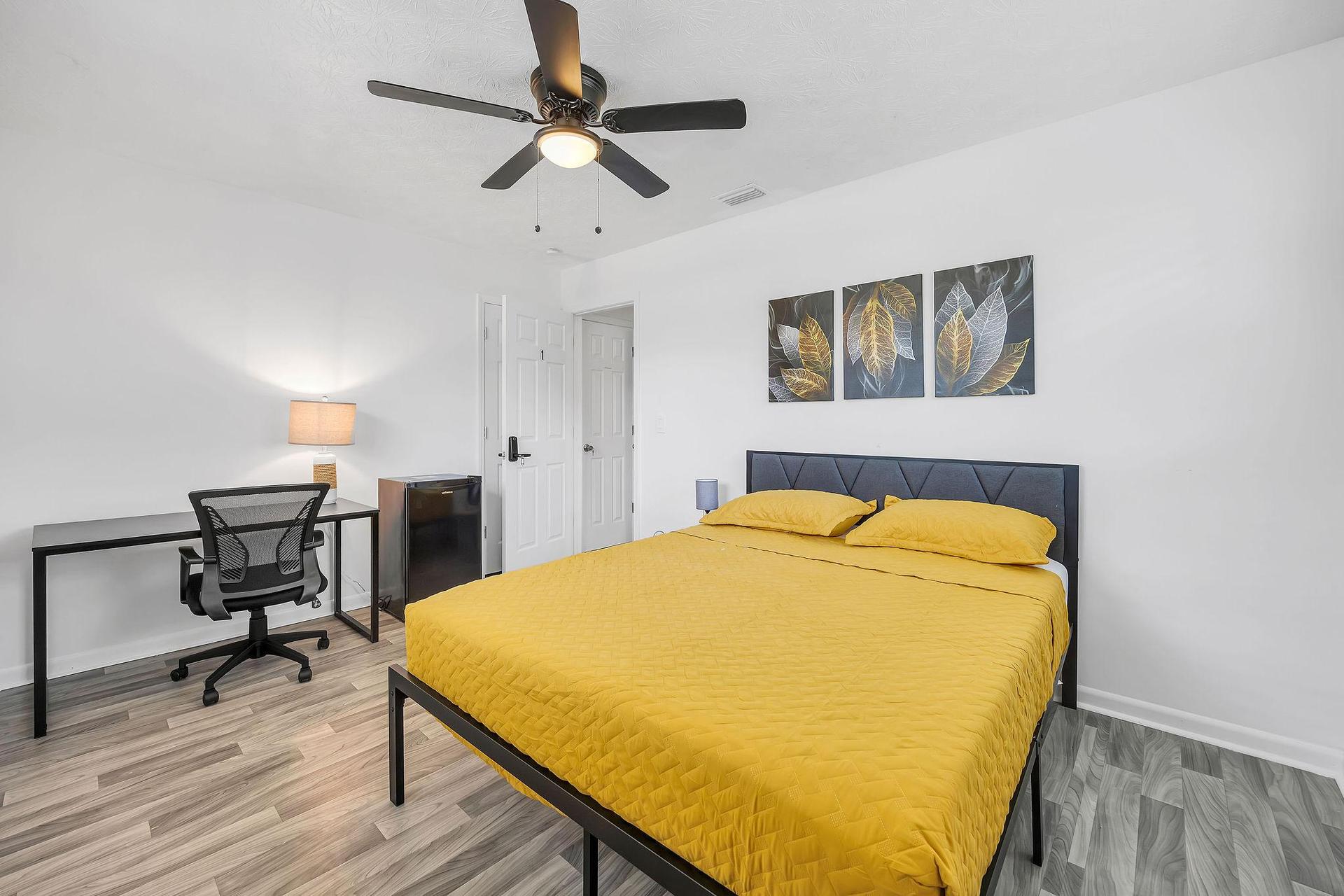 This fully updated bedroom features vinyl floors throughout, a spacious reach-in closet, a convenient mini refrigerator, a ceiling fan for added comfort, a large work desk perfect for productivity, a plush foam mattress for a restful sleep, and two cozy sofa pillows. Welcome to your cozy haven!