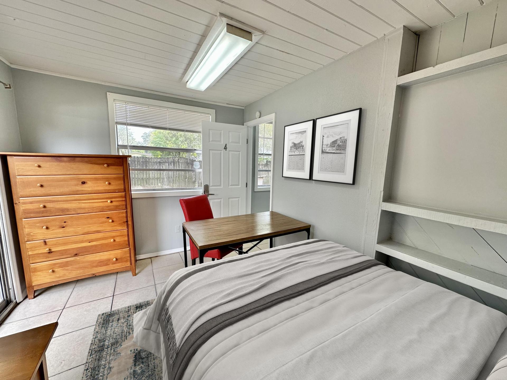 This room allows 1 person only. Room 4 is a large room that offers a comfortable queen bed, large nightstand, large dresser, large desk work space, and closet, this room has an optional private side entrance/patio with slider.