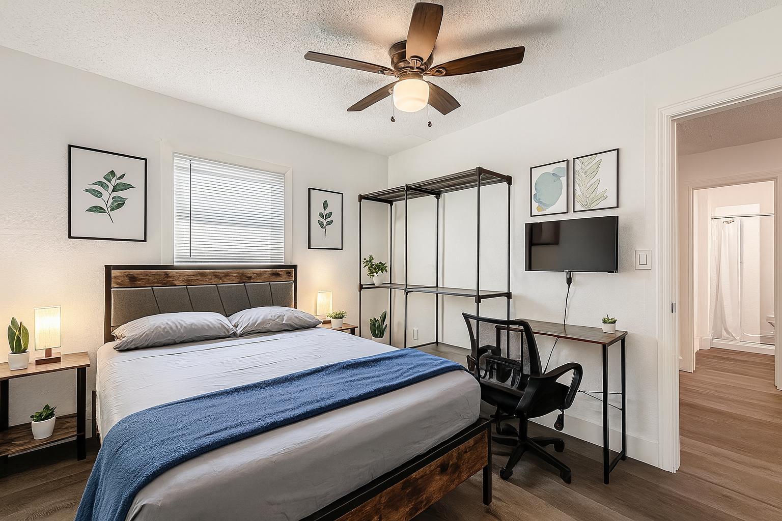 Room includes wardrobe, smart TV, and workspace