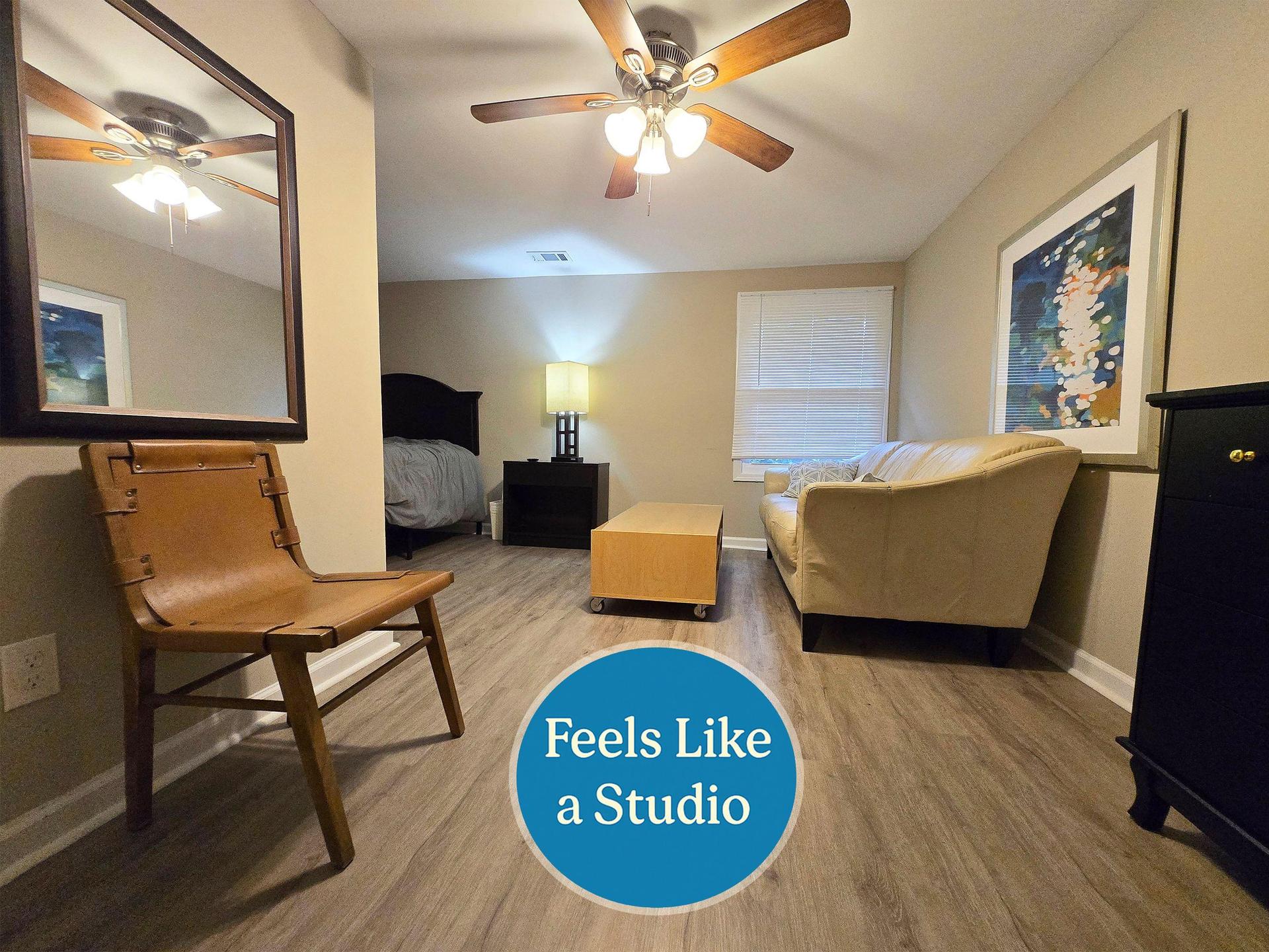 🌟 Oversized Studio-Feel Room | The biggest room in the house—spacious enough for both a sleeping area and a cozy lounge. Includes bed, dresser, closet, couch, chair, coffee table & Smart TV viewable from bed or sofa. 🎥 Tour it here: https://youtube.com/shorts/D3aqt_MtQwM