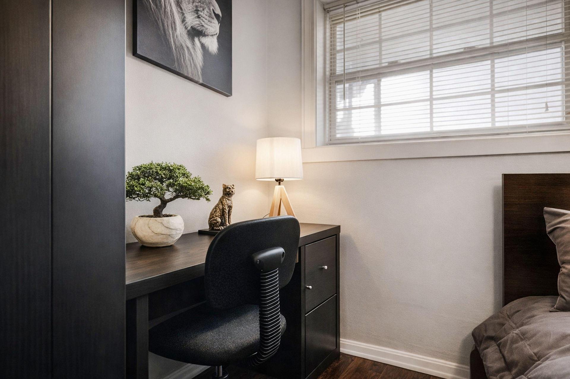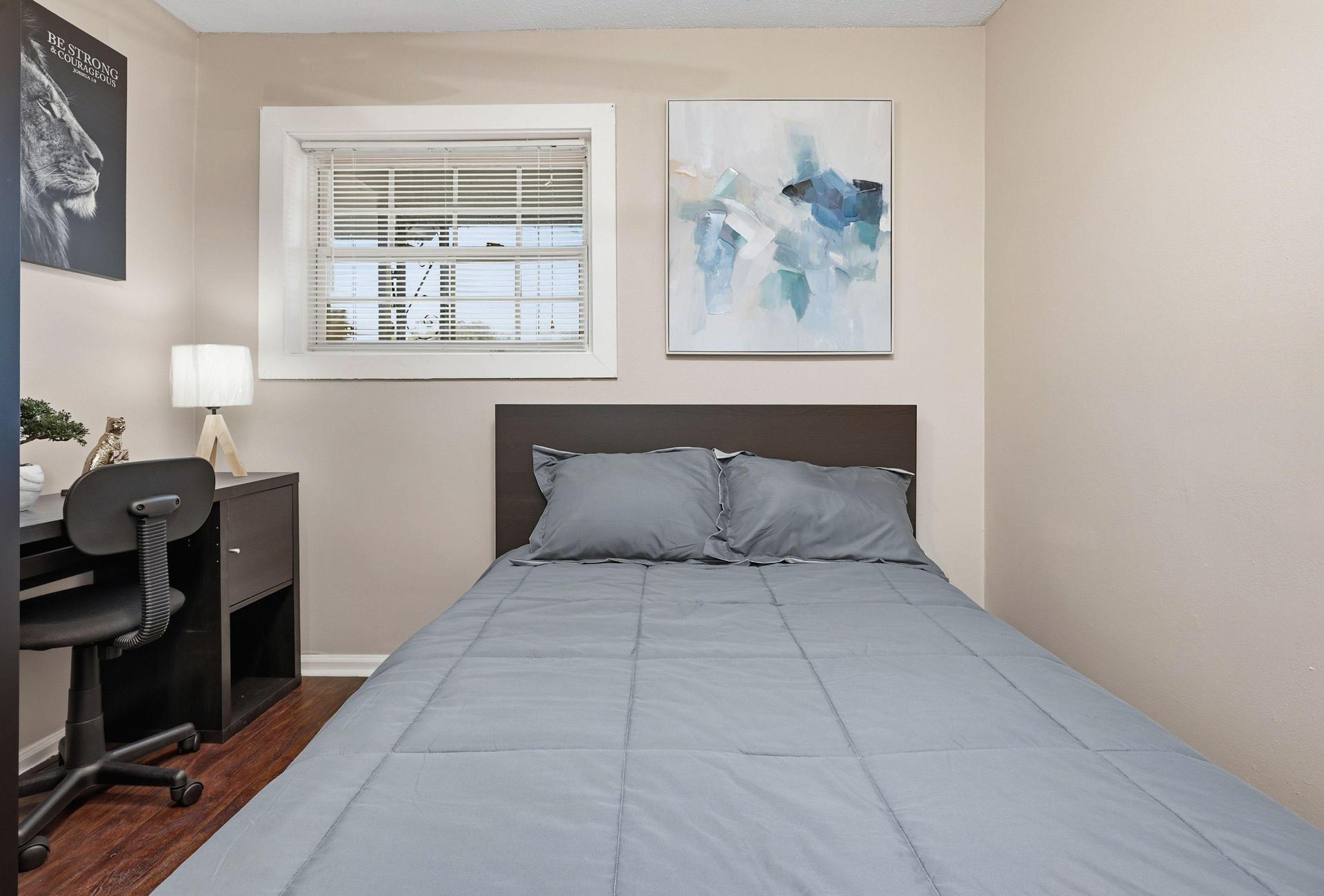 Large bedroom with abundant natural light and hardwood flooring. Fully furnished with a comfortable mattress, closet, nightstand, lamp, secure key-lock door, and a work desk.