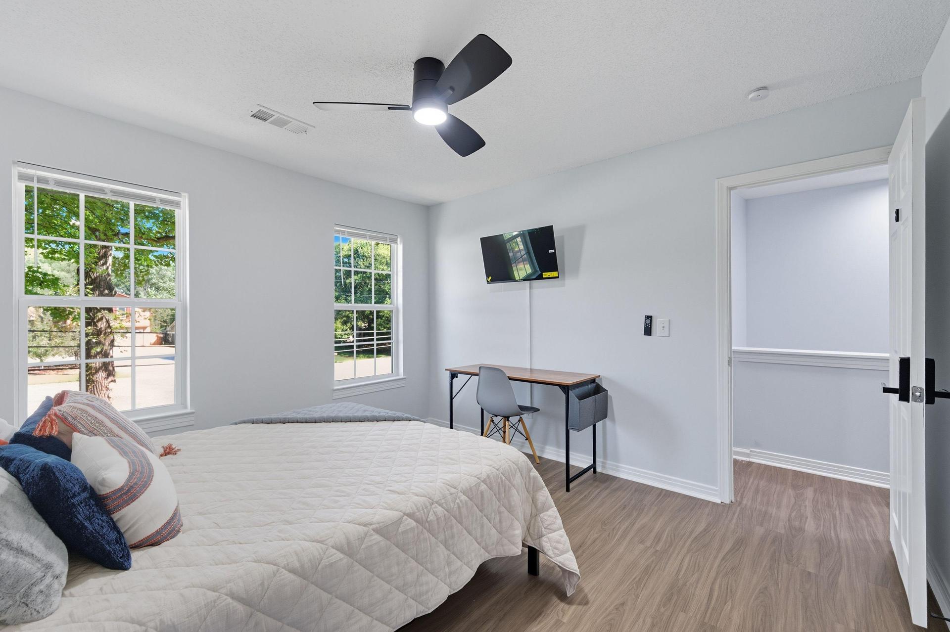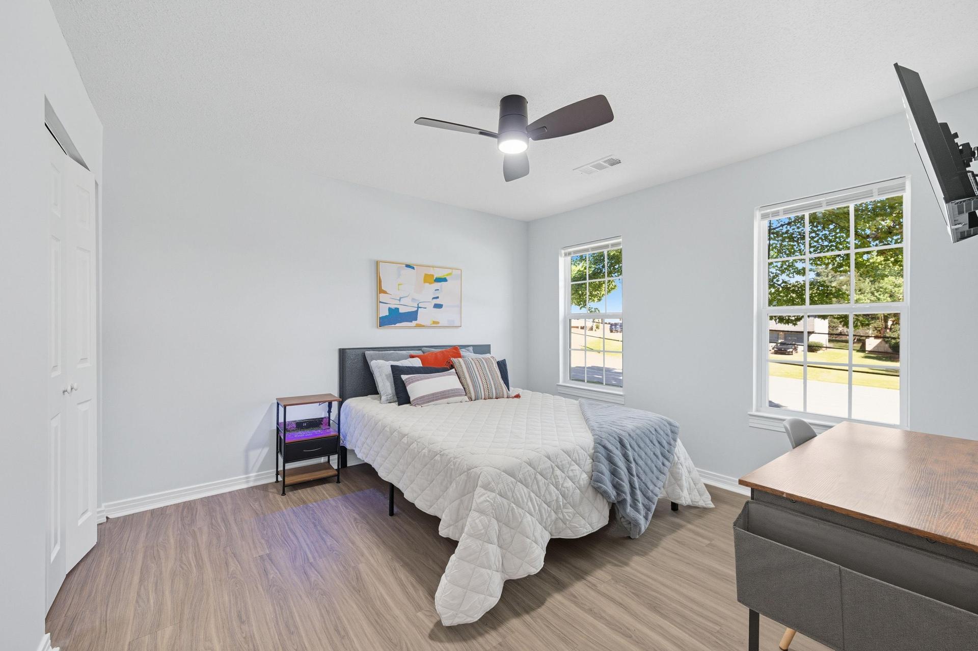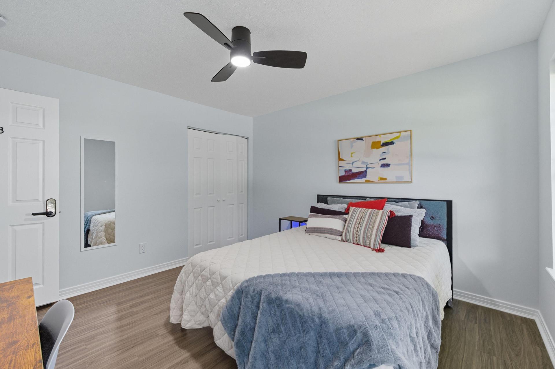 Beautiful and bright, this room offers convenient access to the front door. Inside, you’ll find all-new furnishings—bed, mattress, desk, chair, nightstand, smart TV, full-length mirror, artwork, portable closet, nightstand, and ceiling fan—everything you need for a comfortable stay.