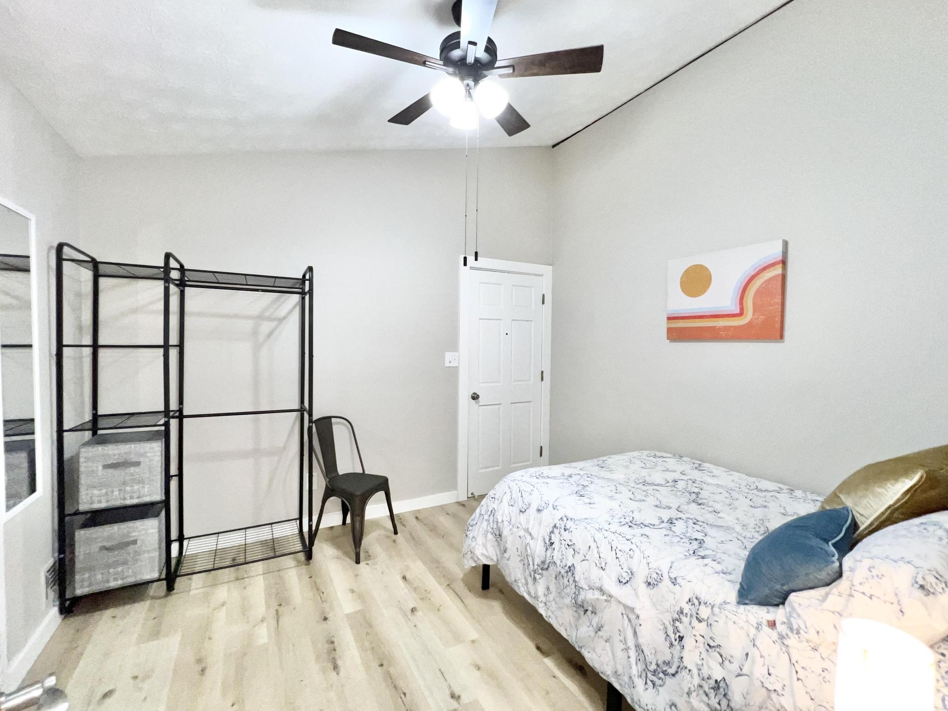 Extra large room with big bright windows, ceiling fan, vaulted ceiling, wardrobe, 4 cube storage piece, full length mirror and a Linenspa hybrid mattress. The neighborhood is peaceful and quiet.