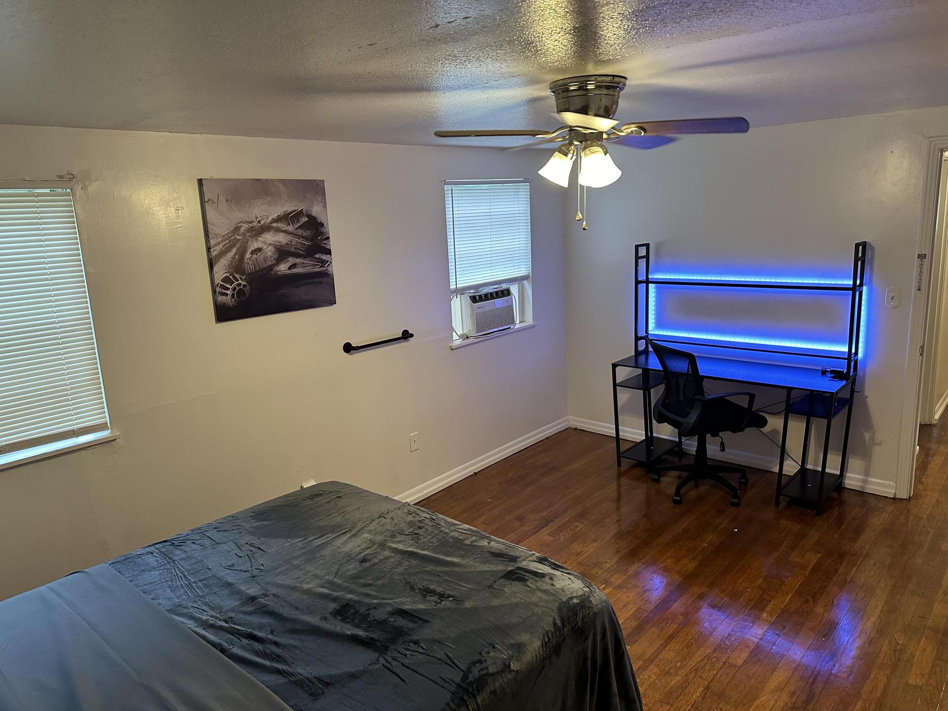 Your Large Bedroom is on the Main Floor just inside the first hallway to Your Left & includes a Queen size Memory Foam Mattress, a Gaming Desk & Comfortable Rolling Chair, Easy Coat Hooks, Towel Rack, Wall Shelf w/ Bathroom Tote Hooks, & Wall Art … all Welcoming You to Your New Home.