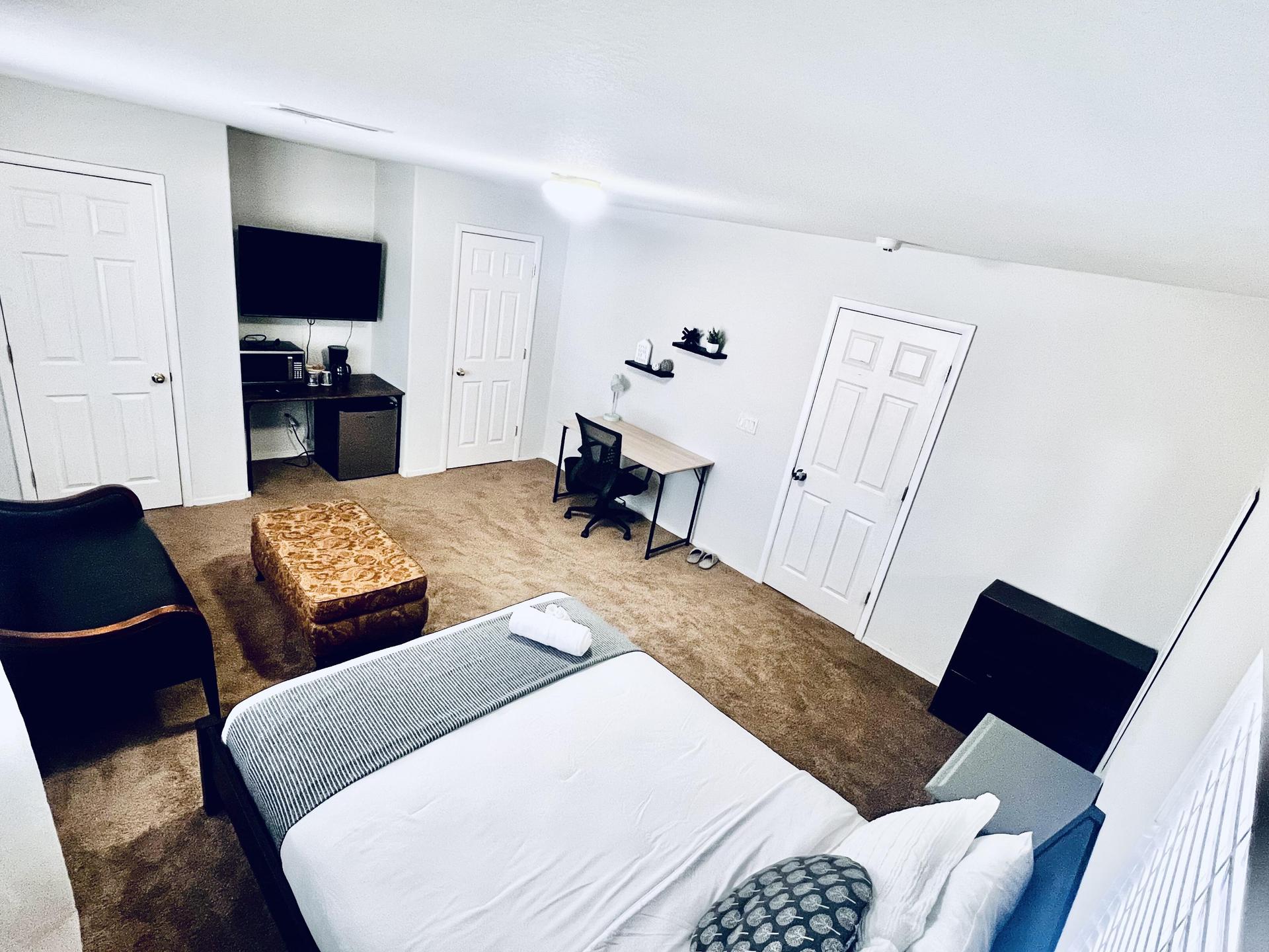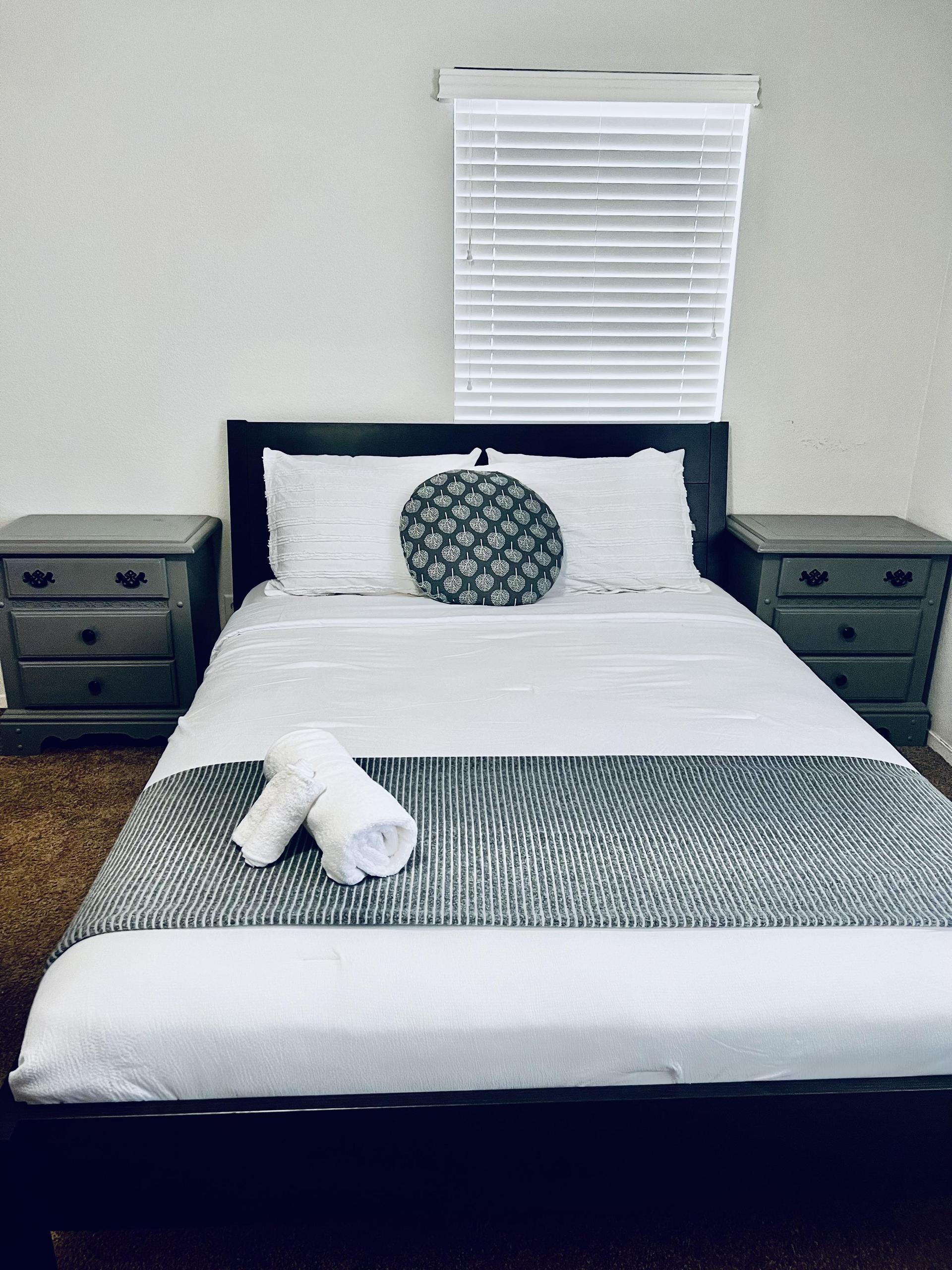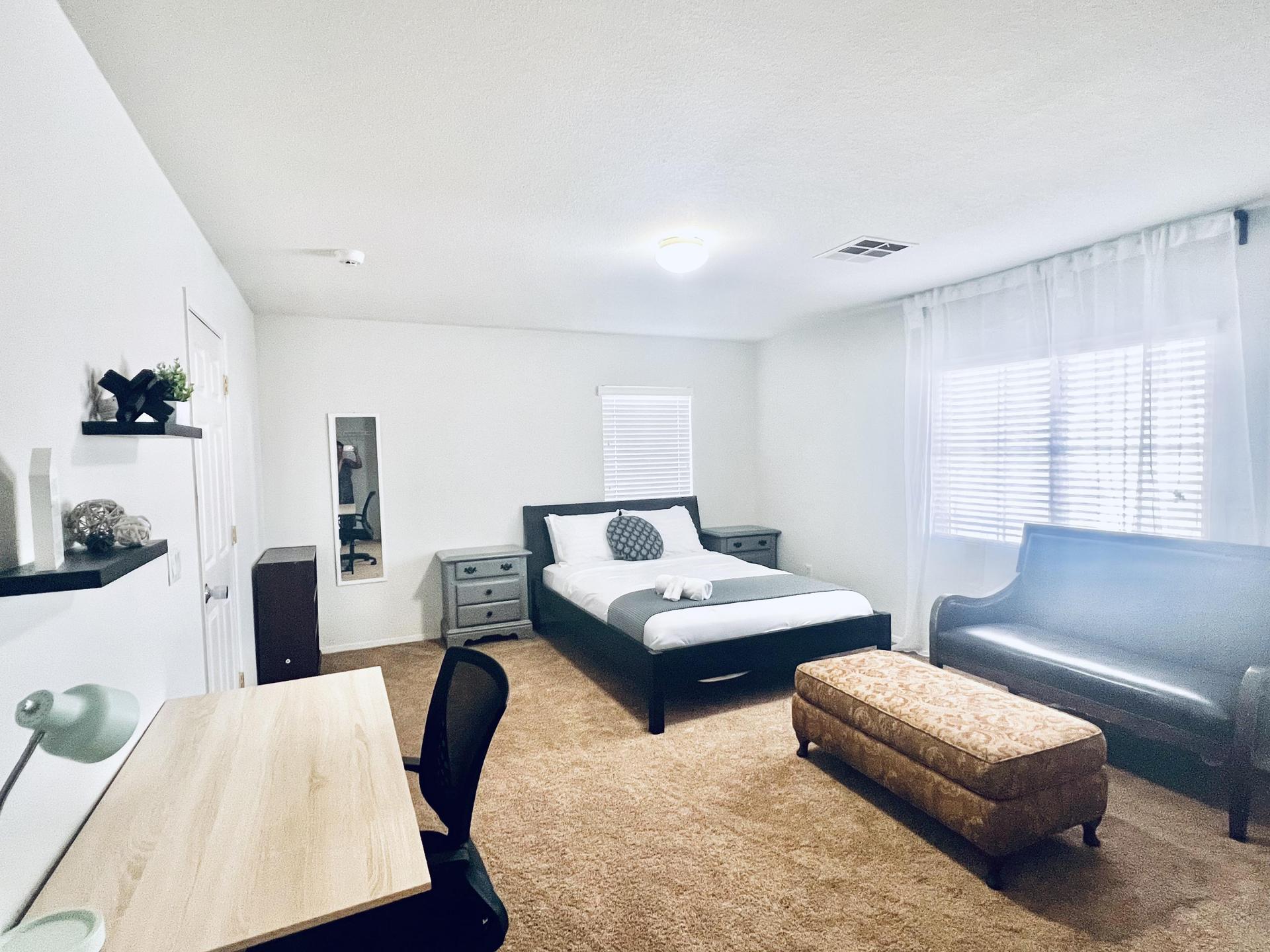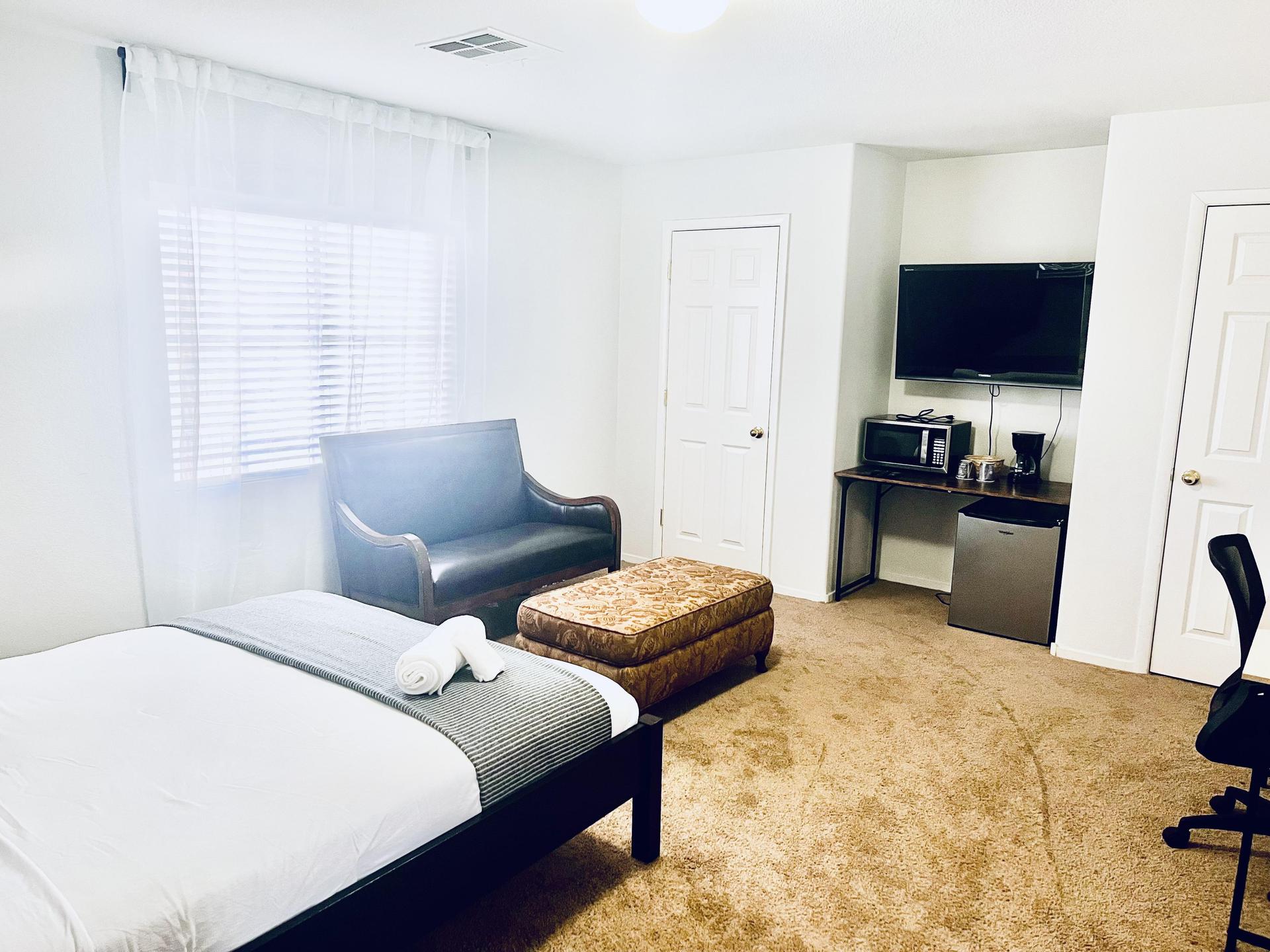 This room boasts a beautiful, cozy, clean space with a wide window offering backyard views and abundant natural light, easily adjustable with blinds and blackout curtains for restful sleep. Includes a large TV for and extra seating ottoman. Your perfect retreat for relaxation and leisure awaits!