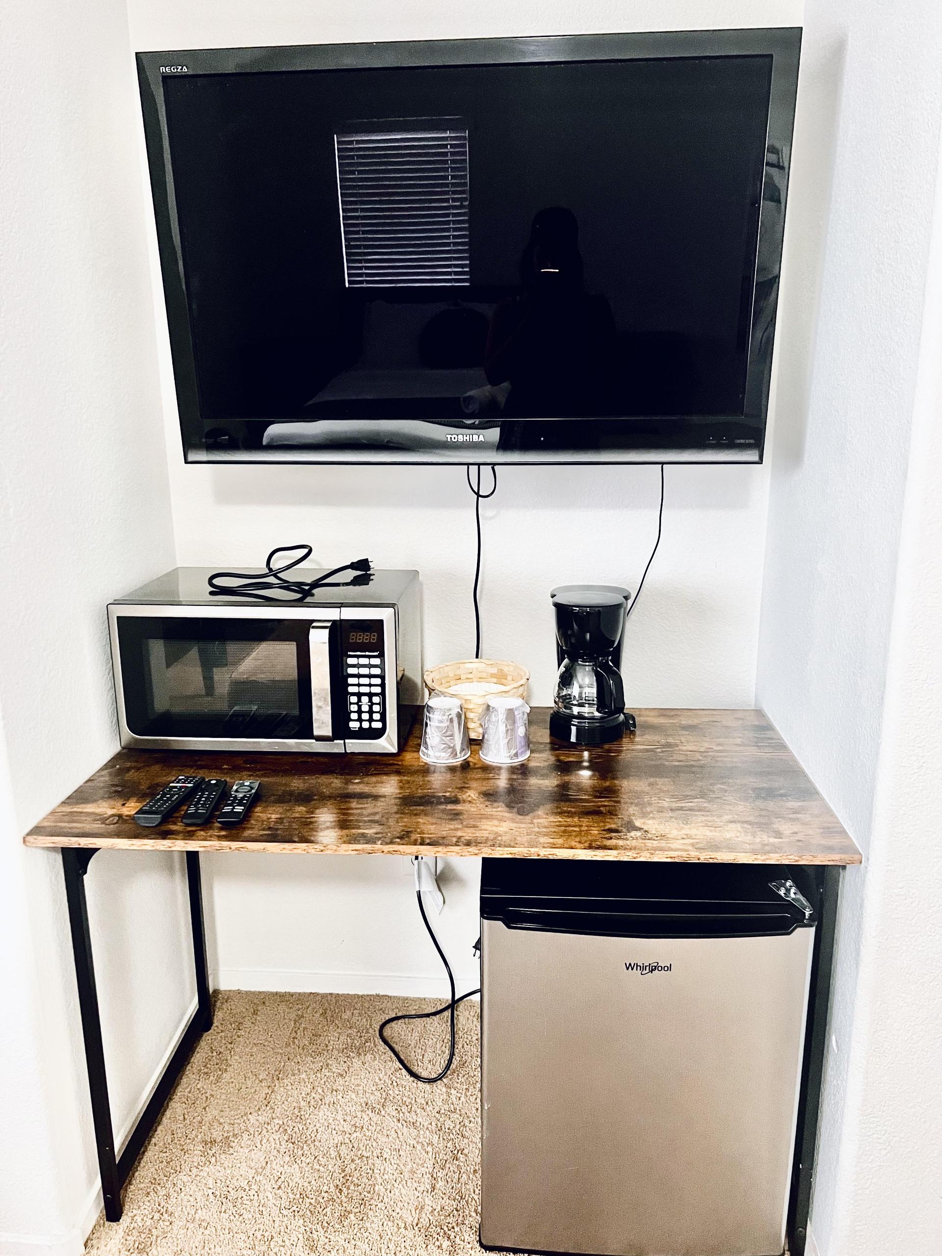 Indulge in the spaciousness of this room, with two closets for easy storage. Dine at the small bar table, work comfortably at the desk, microwave, mini fridge, coffee maker and enjoy entertainment on the TV. With views of the street and side, it sets a cozy ambiance ideal for unwinding