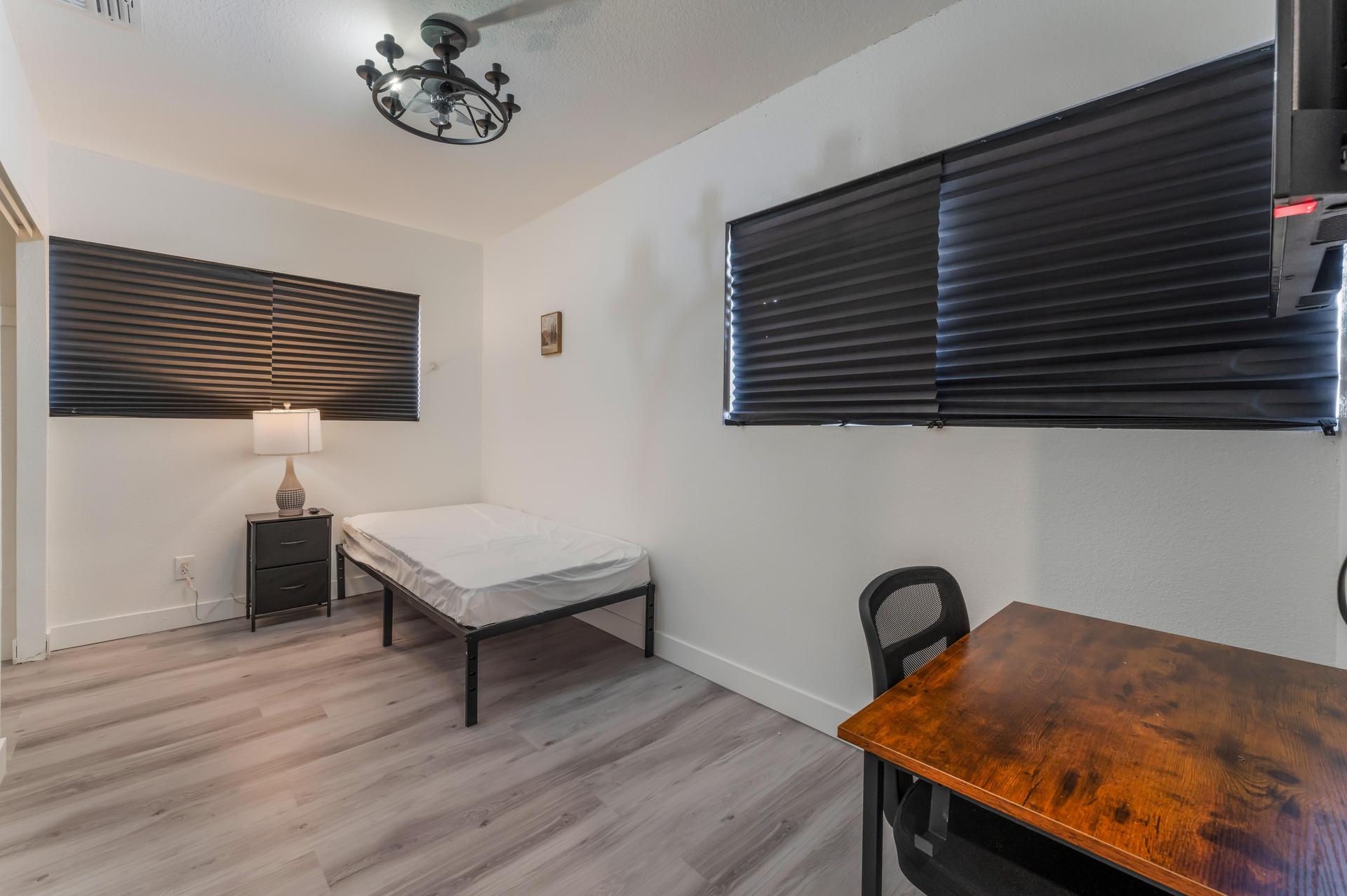 What can I bring?In this cozy bedroom, a plush twin XL size bed invites relaxation, complemented by a sleek wall-mounted TV for entertainment. A 22-inch fandelier ceiling fan ensures comfort, while two windows flood the space with natural light. Minimalist decor and a versatile desk complete this tranquil room.