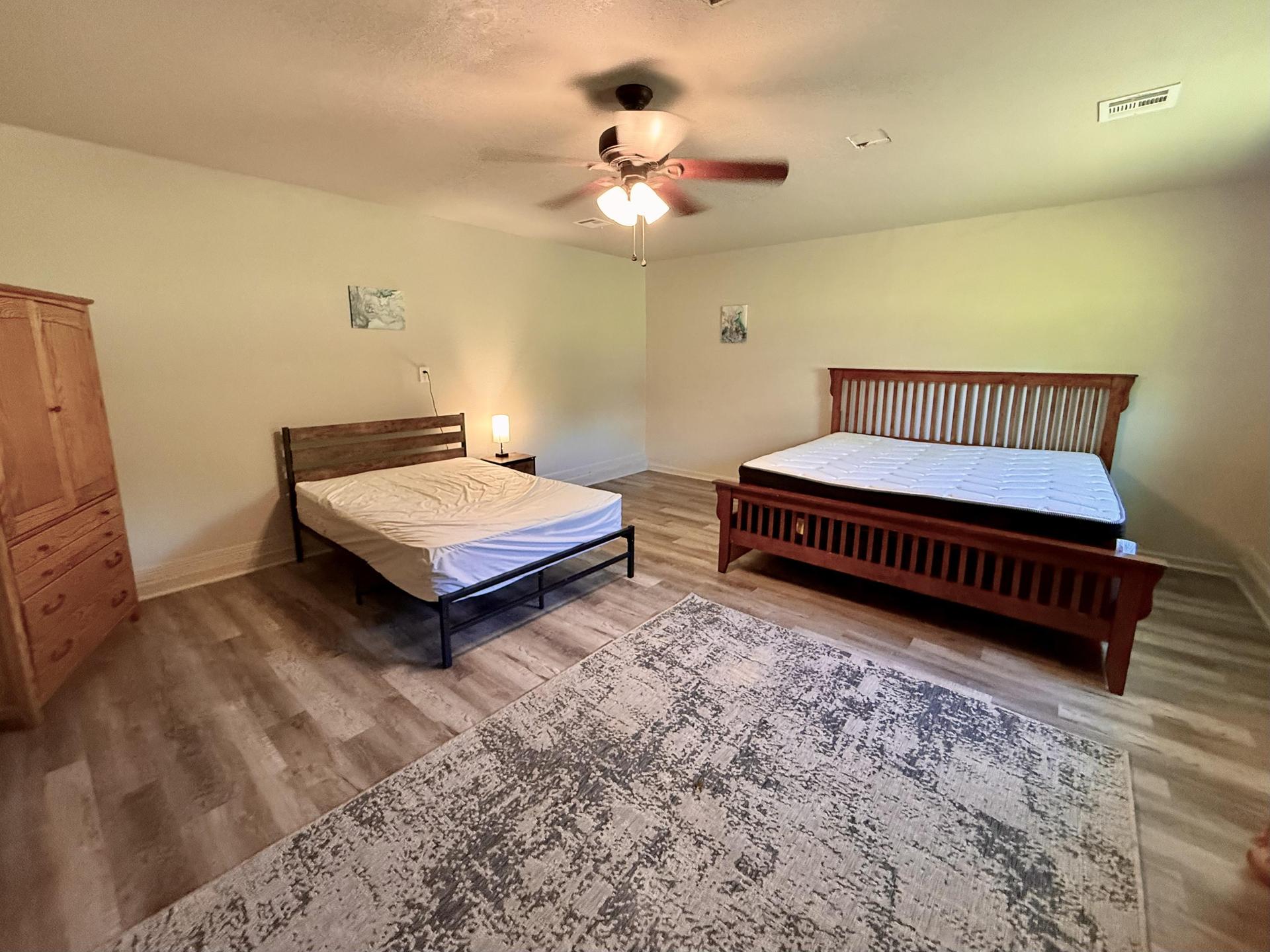 Largest room in the house with space for a couple, a service dog, a keyboard and desk, etc.. with plenty of storage.