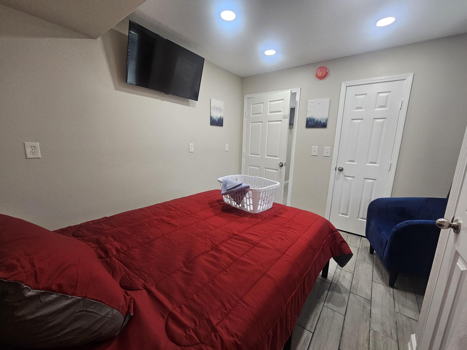 Room 9 is on the second floor and shares a bathroom with rooms 7 & 8. It's a fully furnished room with full size memory foam bed, night stand with lamp, wall mounted 42" flat screen smart TV, Ceiling fan, Mini Fridge, and chair, and a walk in closet.