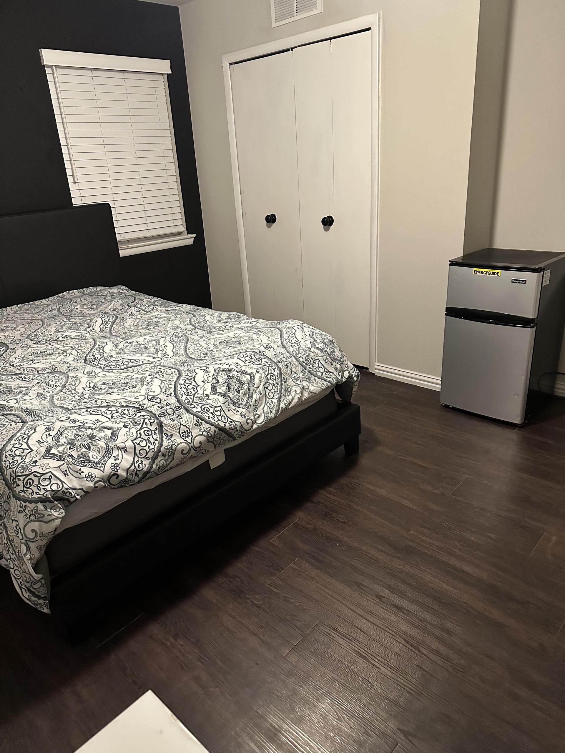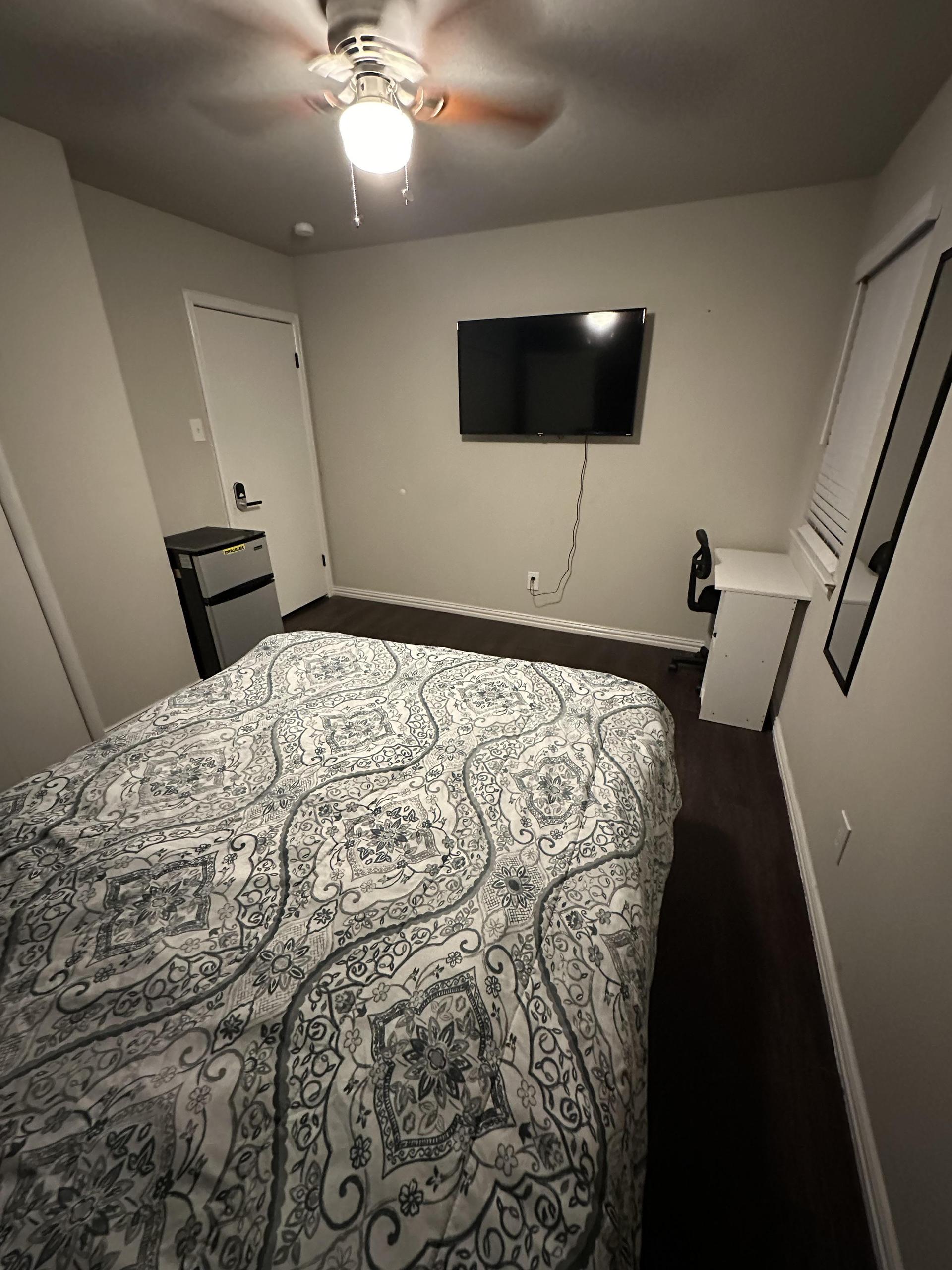 Big room! Doesn’t share walls with other rooms. Big 50” smart Roku TV, and work desk with chair. Queen bed and mini fridge in room.