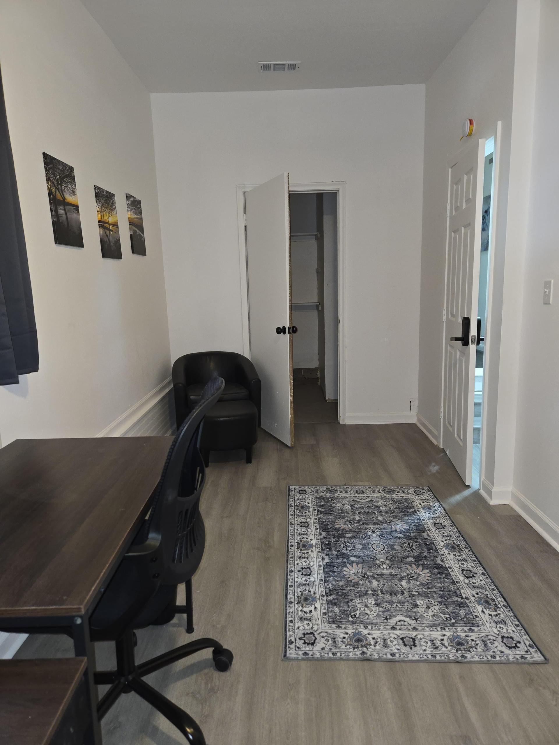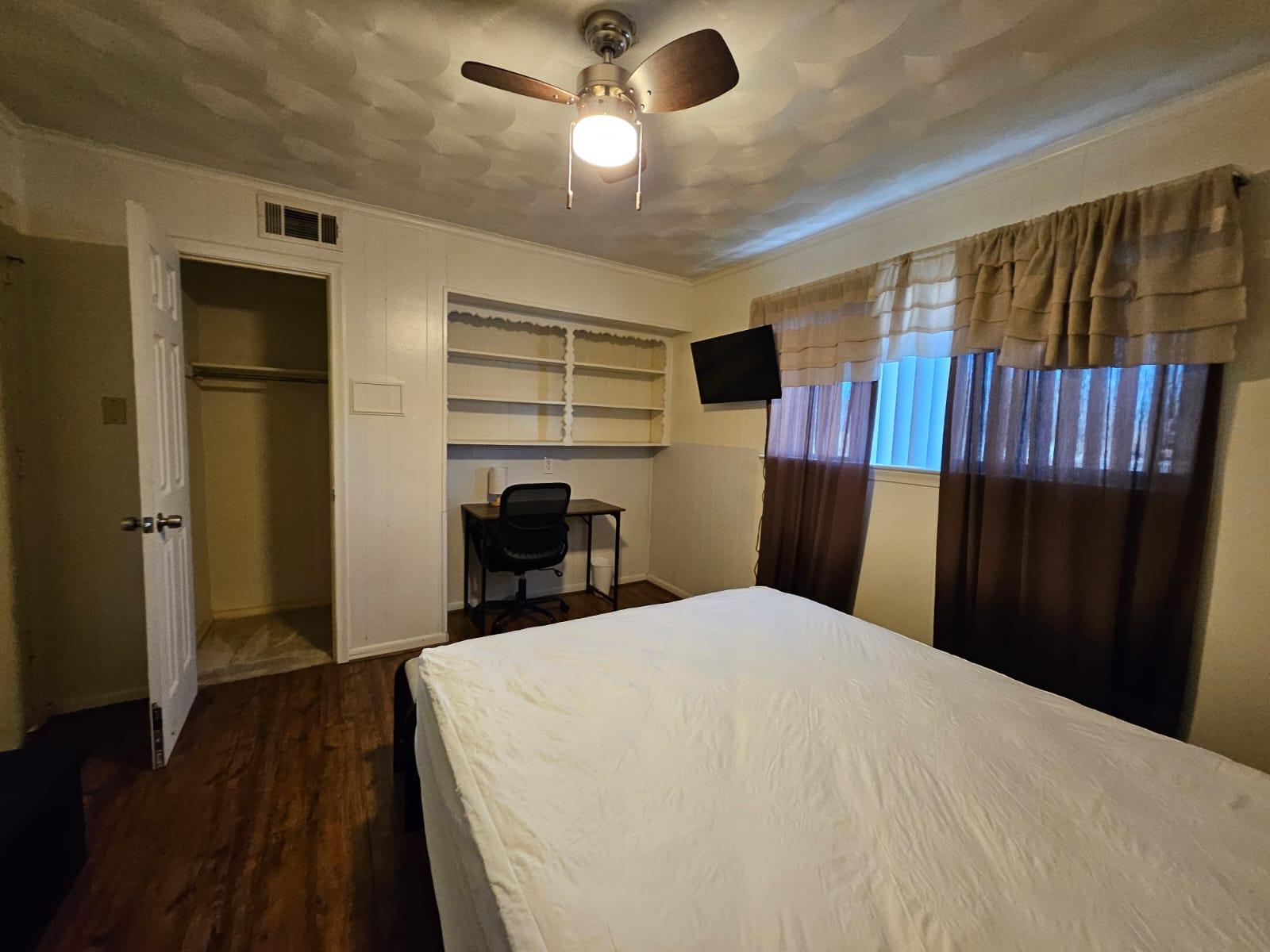 Very large room with a spacious walk-in closet. It also includes arm chair with ottoman, TV, office chair, desk table, and dresser for extra storage.