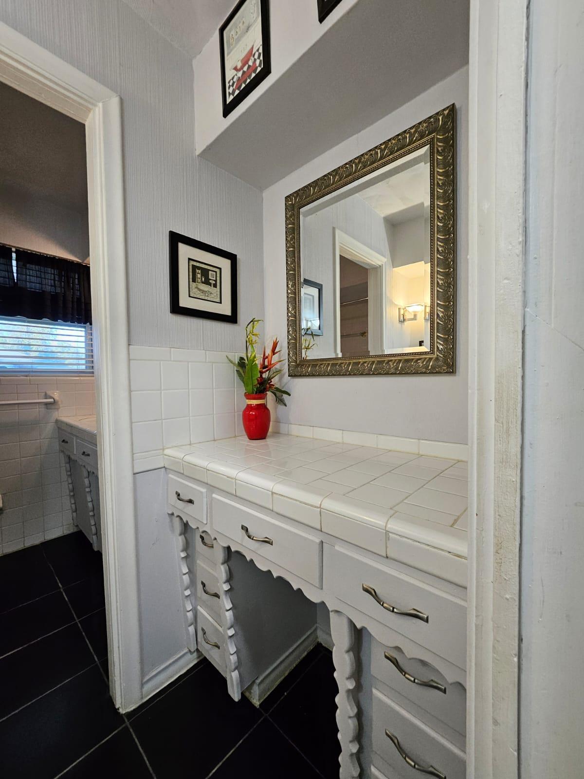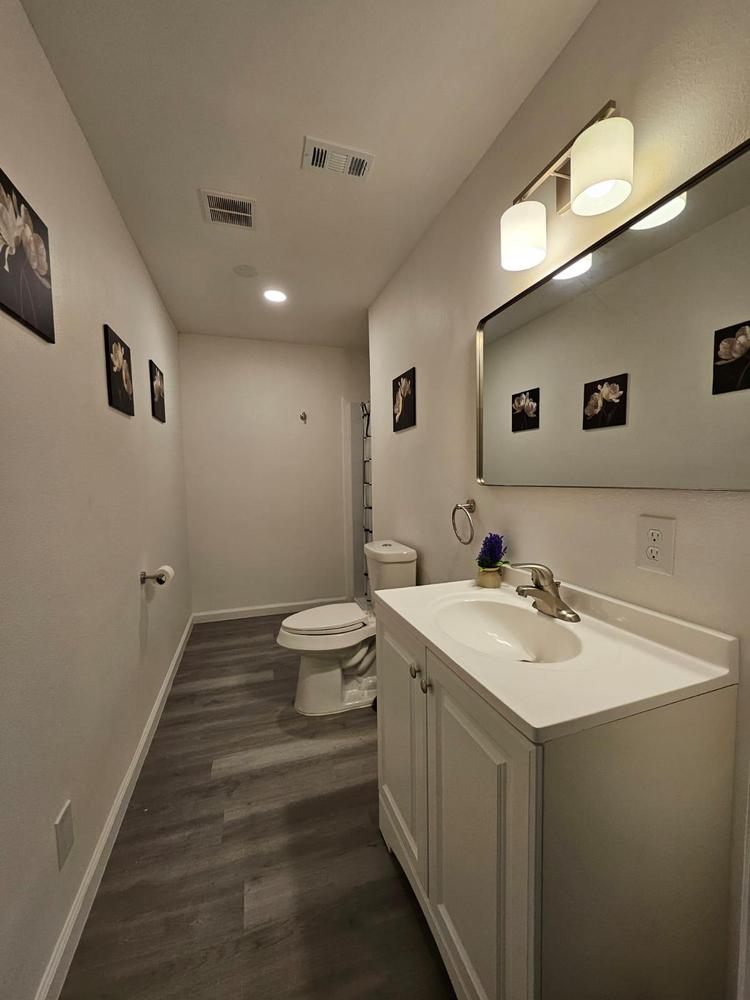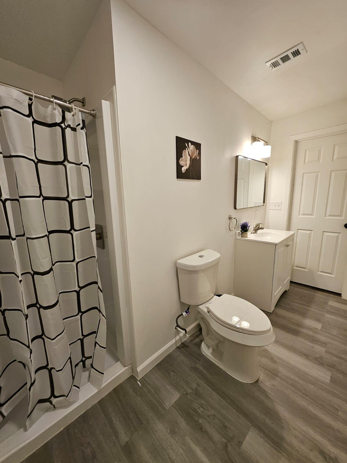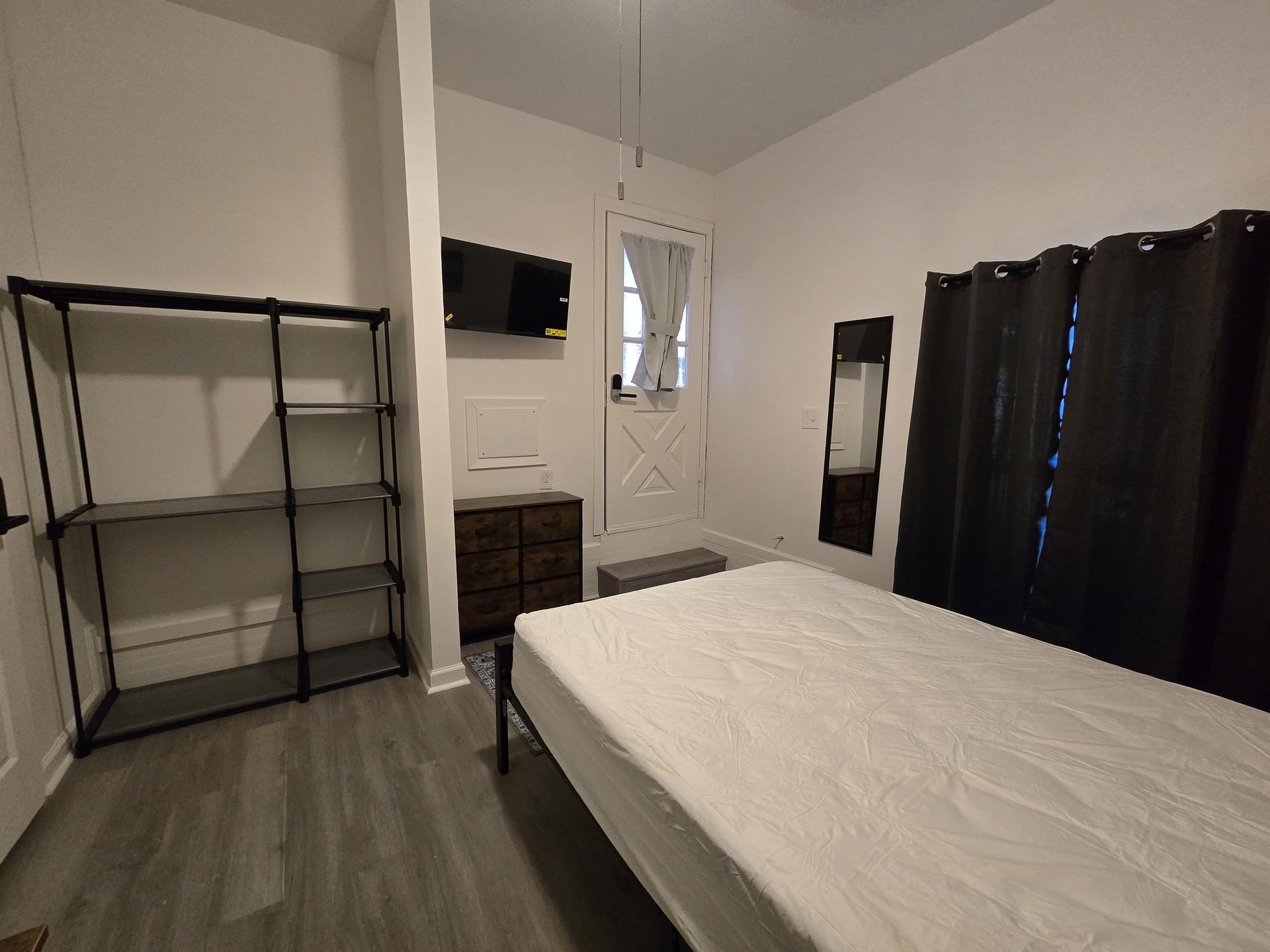 Renovated bedroom with two doors making access to the room more convenient and easier. It also includes dresser, TV, office chair, and desk table.