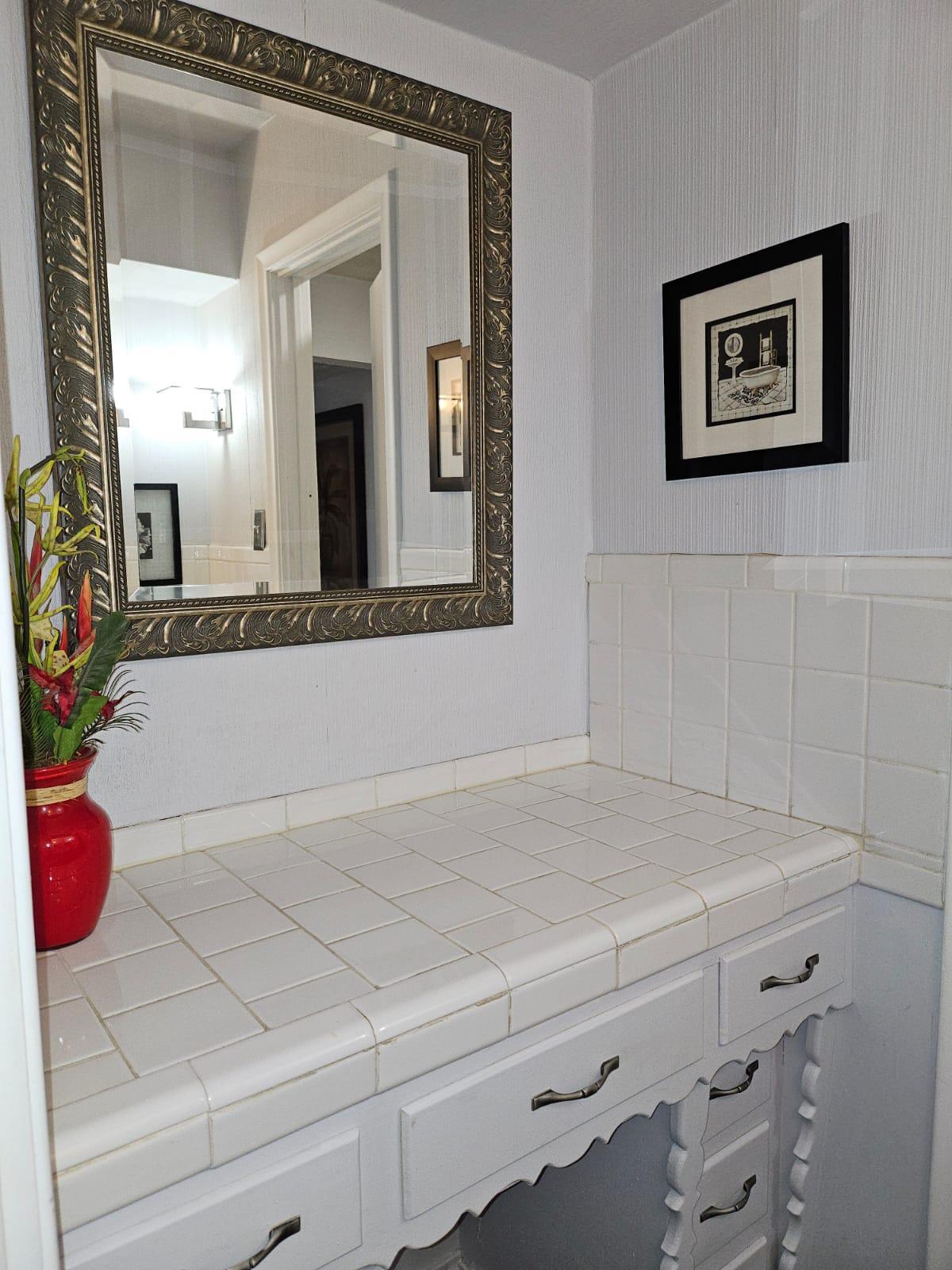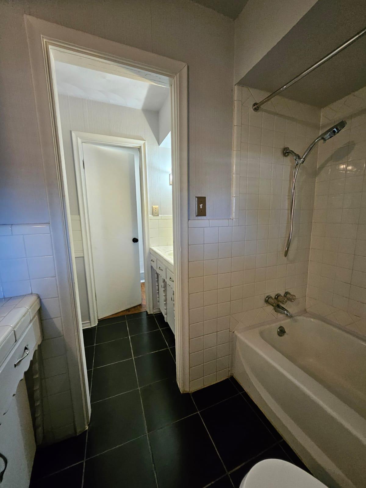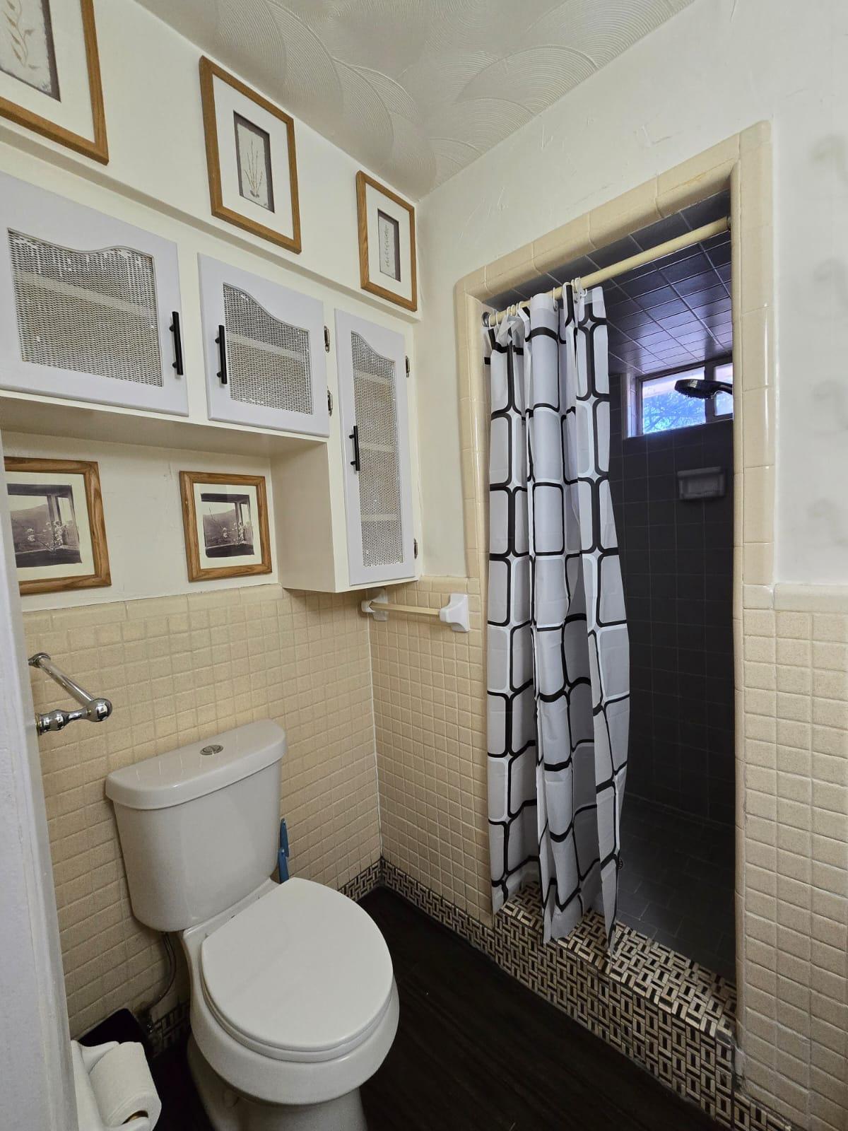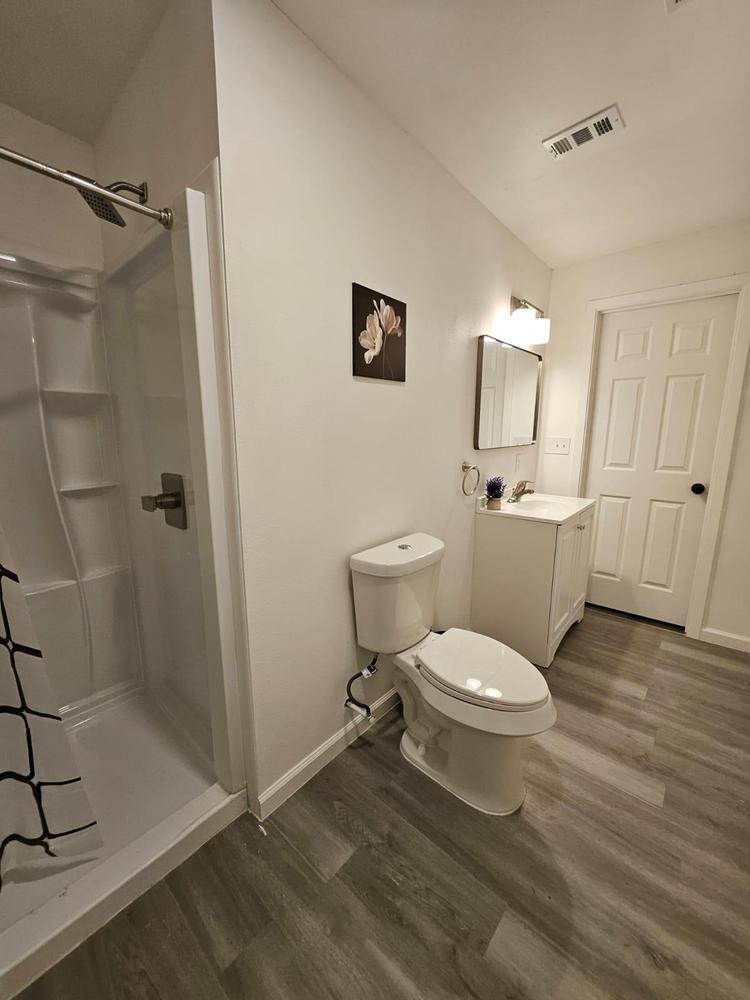 Renovated bedroom with two doors making access to the room more convenient and easier. It also includes dresser, TV, office chair, and desk table.