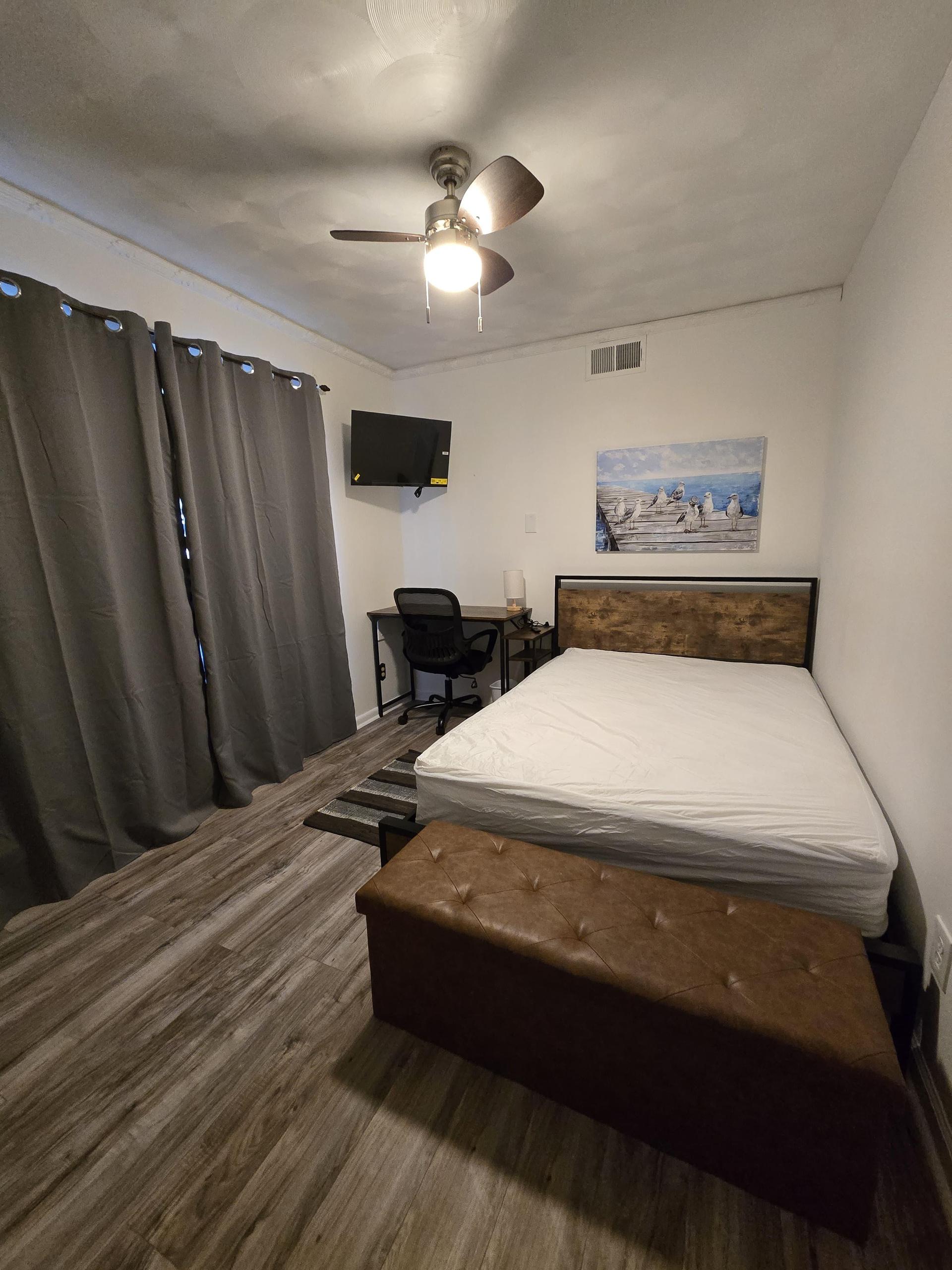 Cozy bedroom with tv included, storage bench for extra space, office chair, and desk table