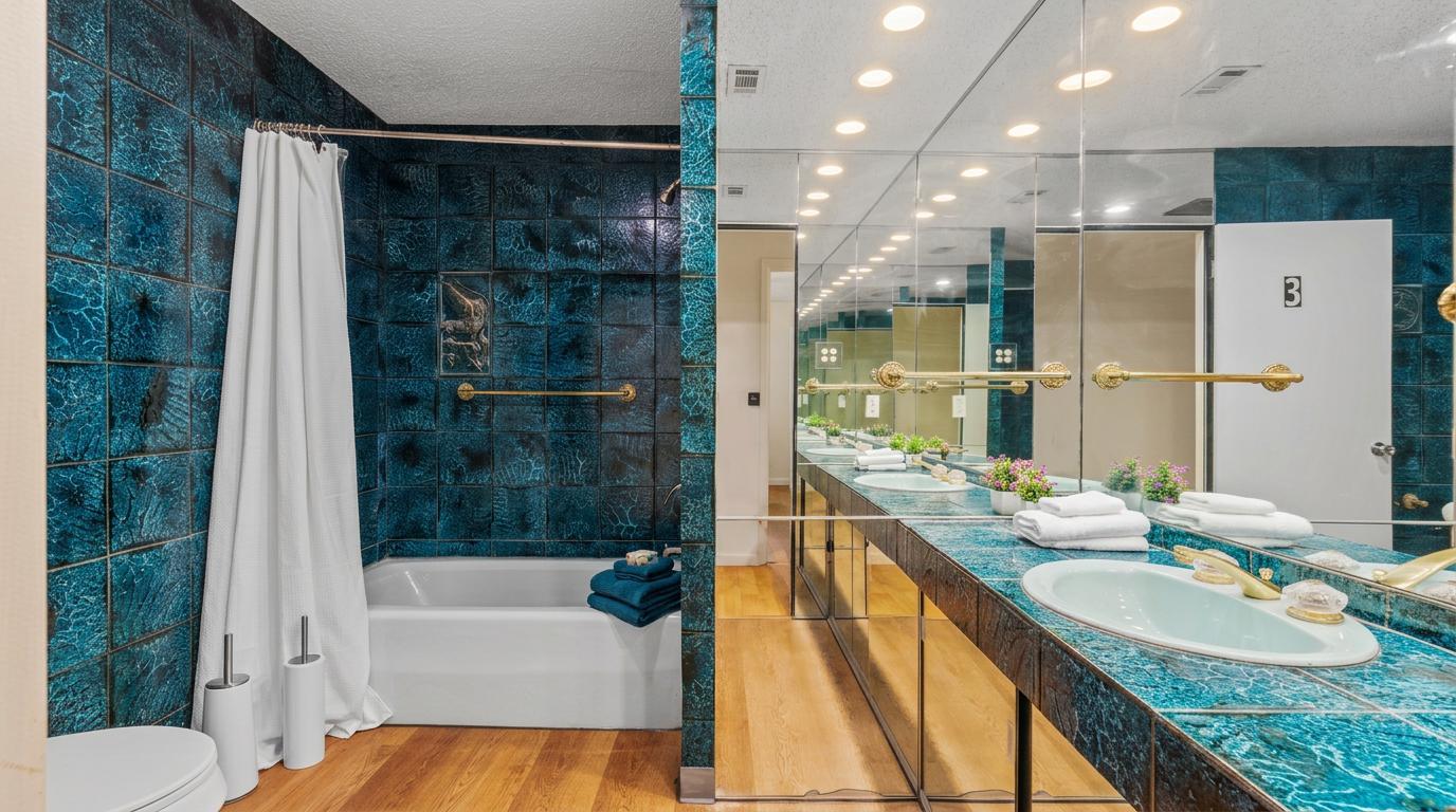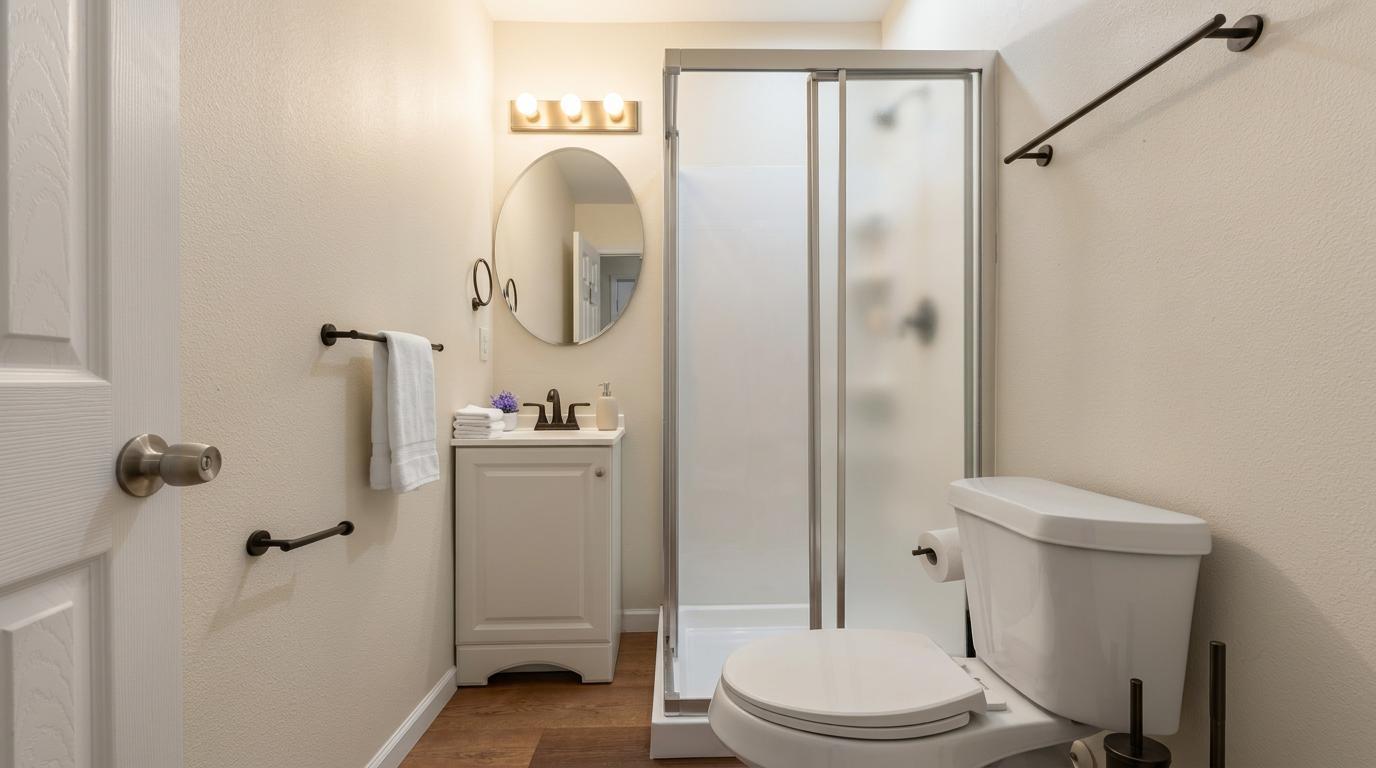 Unique first-floor room featuring a full bed, wardrobe, and workspace. Includes a private sink, mirror wall, and built-in countertop. Central AC, smart lock, and ceiling fan included. No stairs. πΈ Photos are staged; linens and decor not included.