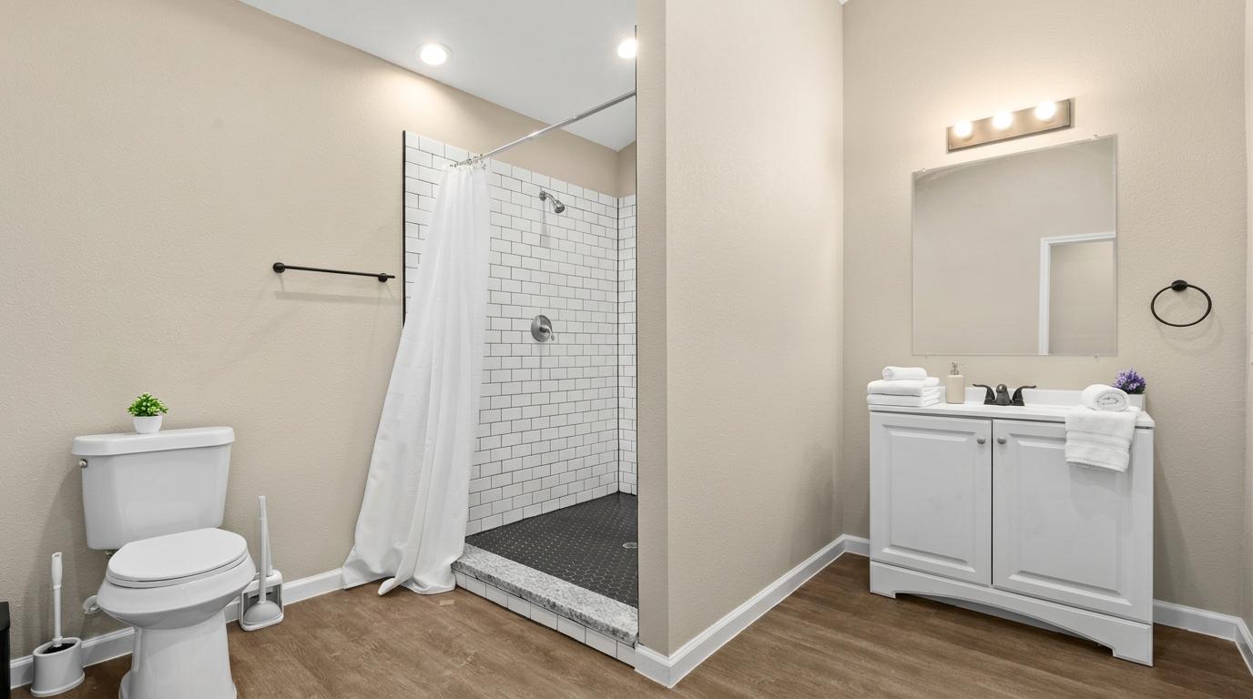 Standard first-floor room with full bed, wardrobe, and workspace. Features central AC, smart lock, and extra storage. No stairs required. Shared full bath. πΈ Photos are staged; linens and decor not included.