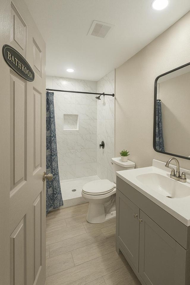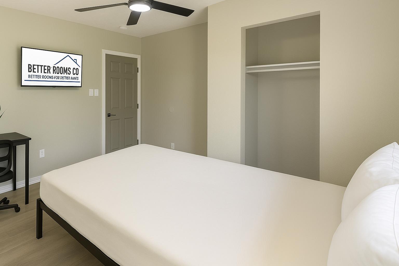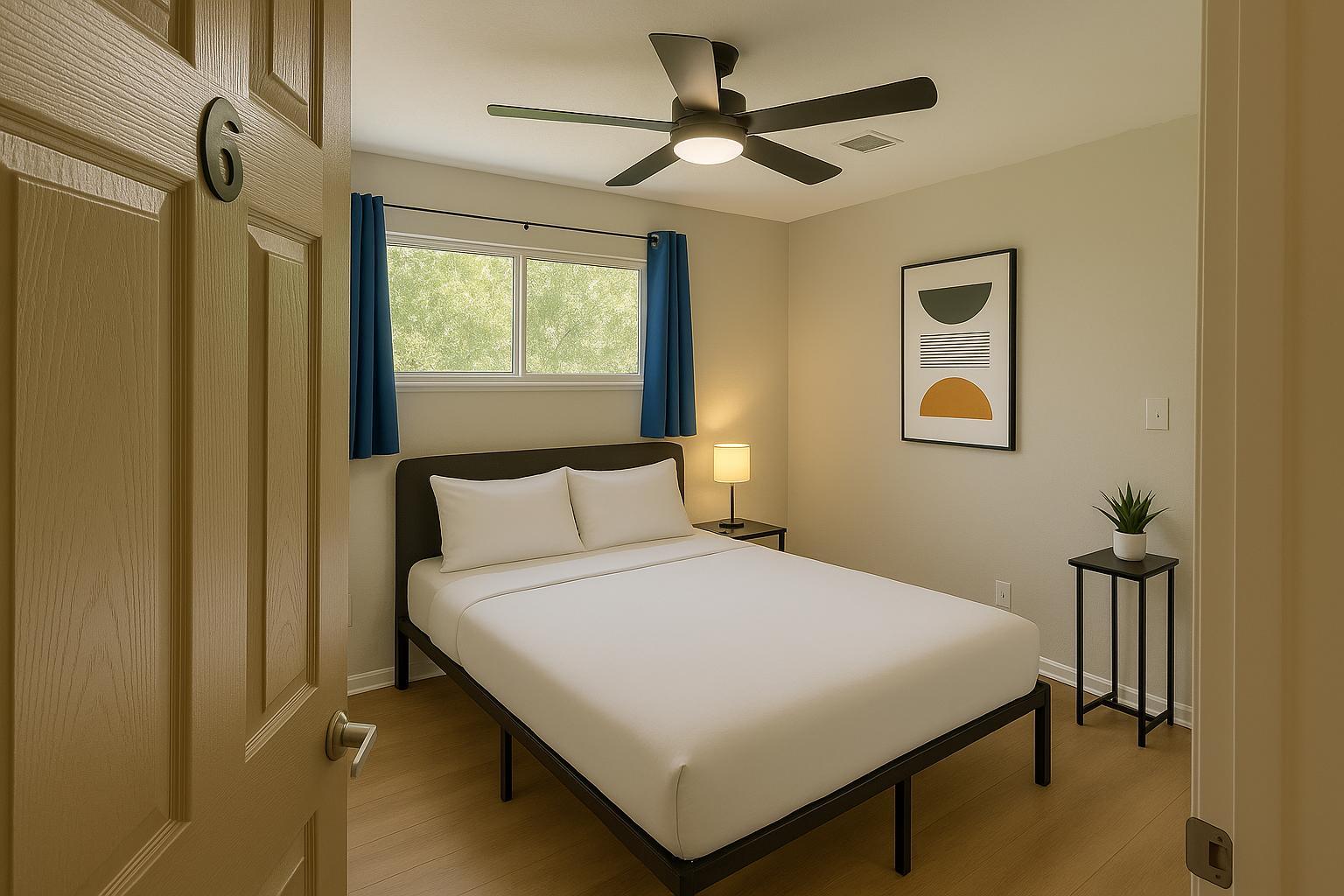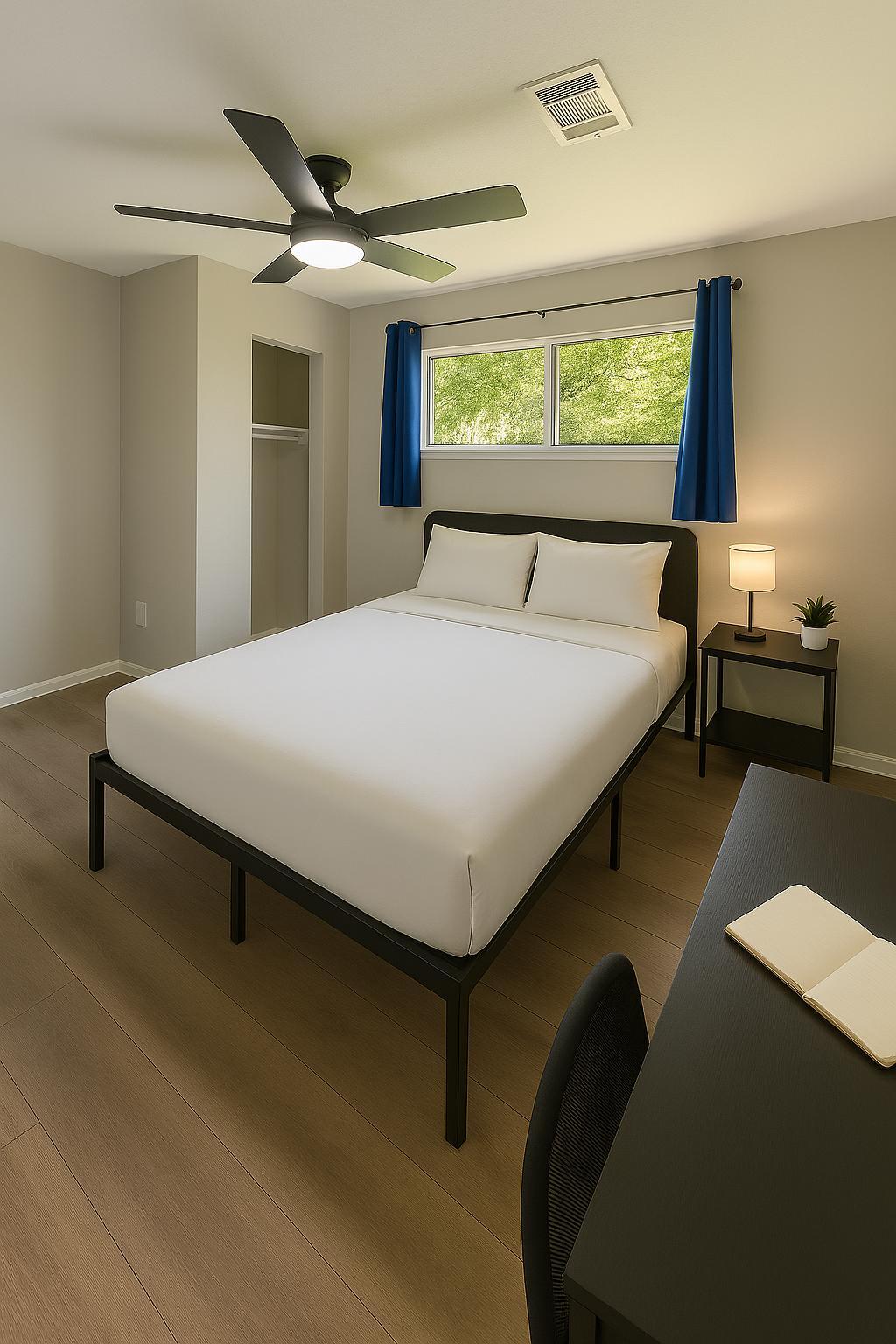 Feel right at home in this oversized ground-floor room 🏡 Full bed 🛏️, breezy fan 🌬️, workspace 💻, seating 🪑 & walk-in closet 👕. Secured with punch code 🔐 + shared bath 🚿. Hosted by a ⭐Top-Rated⭐ manager known for fast response & top-tier service! 💬✨