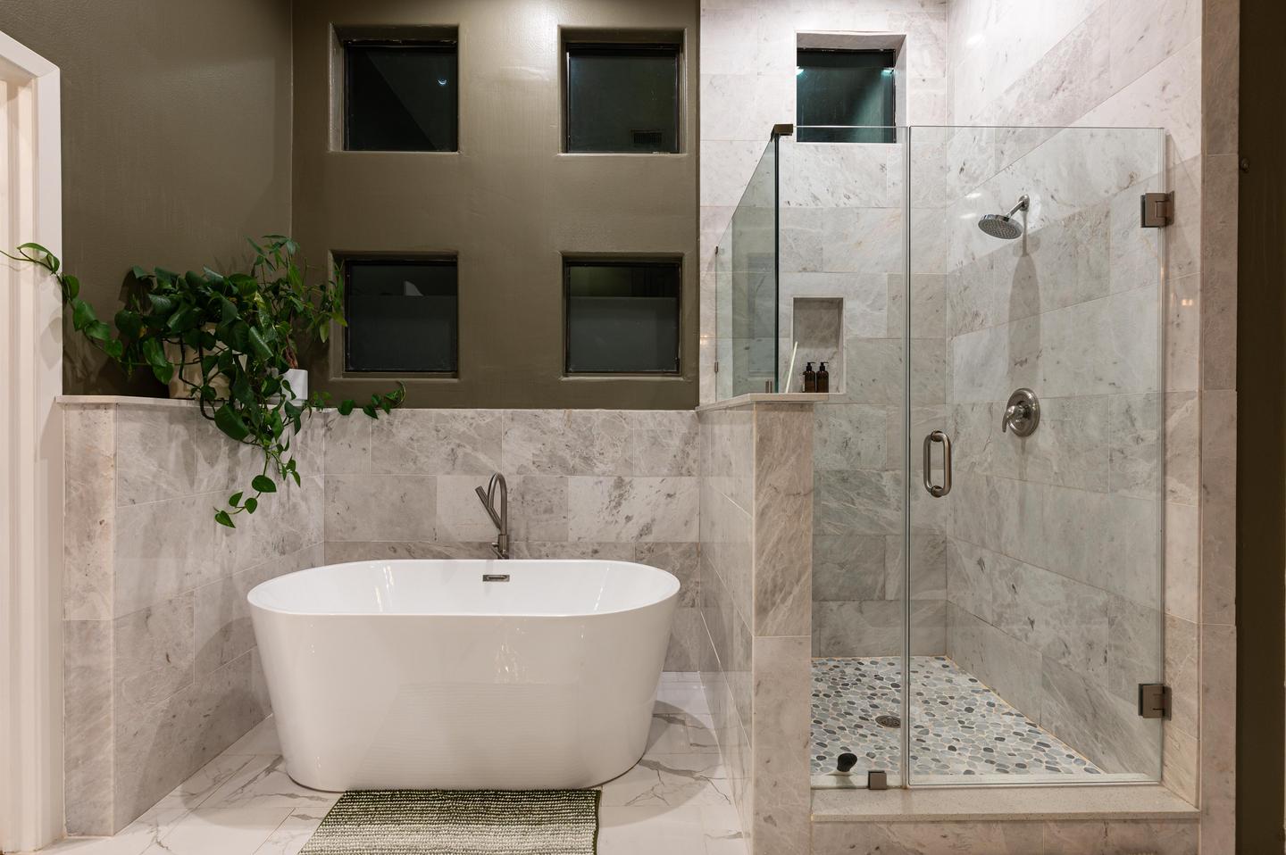 Master bedroom with a king bed and spa-style ensuite bathroom. Bedroom located on the third level, with private bathroom.