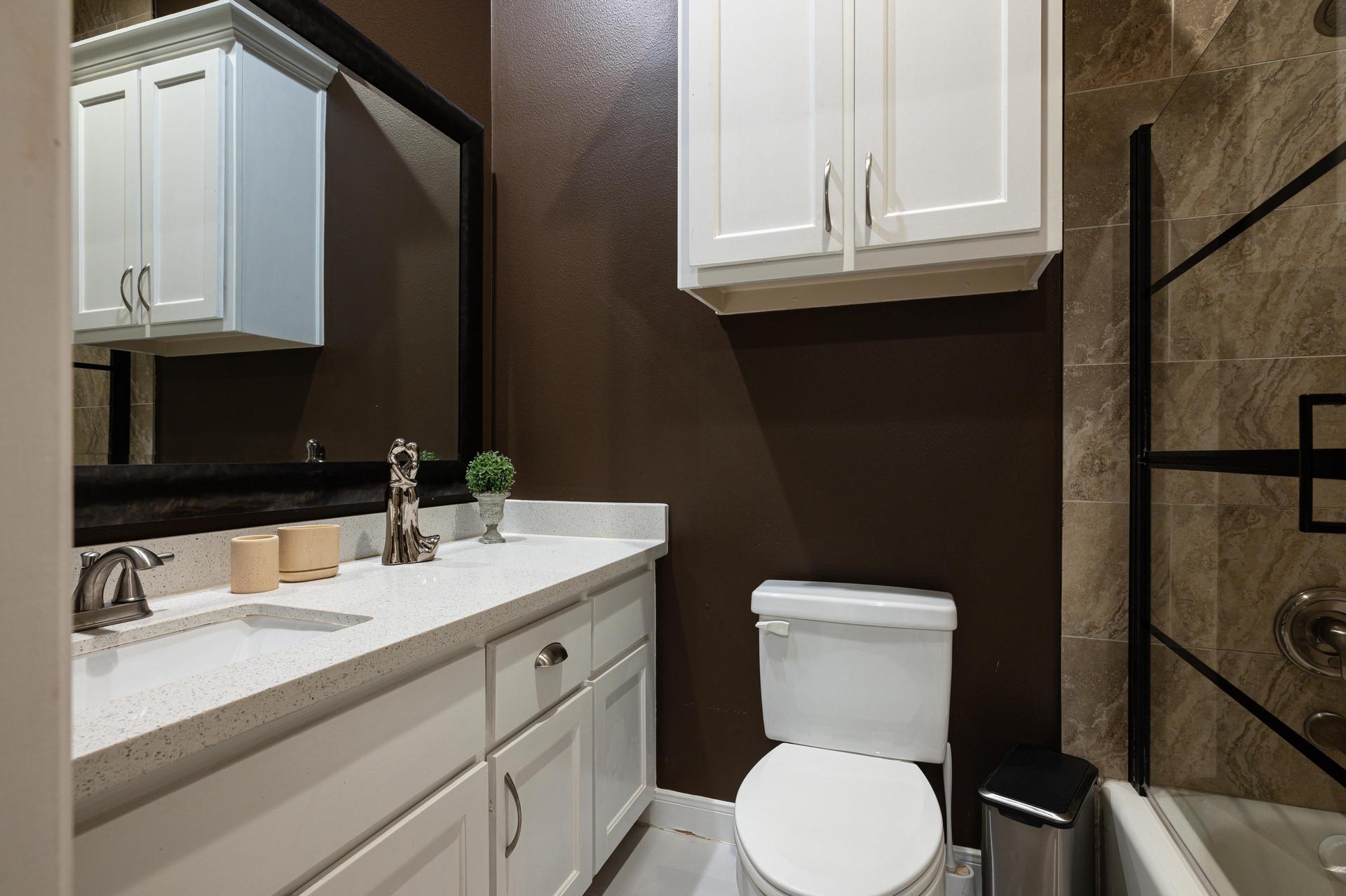 Queen bedroom with direct backyard access and a full bathroom. Bedroom on the first floor with private bathroom.