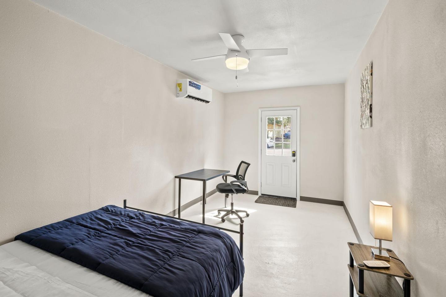 Private entrance with feel more privacy and nice lighting. You have queen bed with mattresses and ergonomic chair and desk with separate fan and AC/Heater. High speed internet will help make your work from home job easier. Easy access to parking.