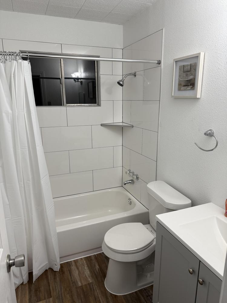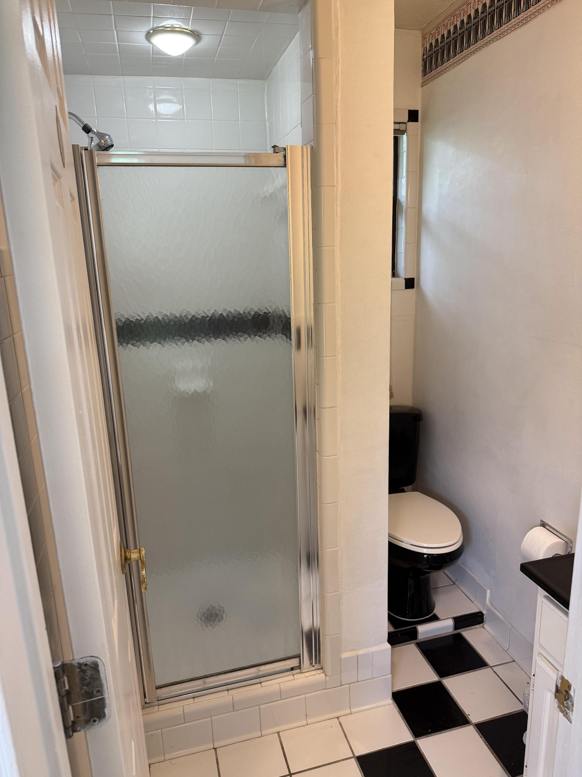 Ensuite bedroom/bathroom with exterior electronic keypad entry door. Bedroom is furnished with a storage full-size bed, mattress, mattress protector, nightstand, lamp & apartment-size fridge. Interior bedroom door also has a keypad lock for added security. Room is separated from other bedrooms.